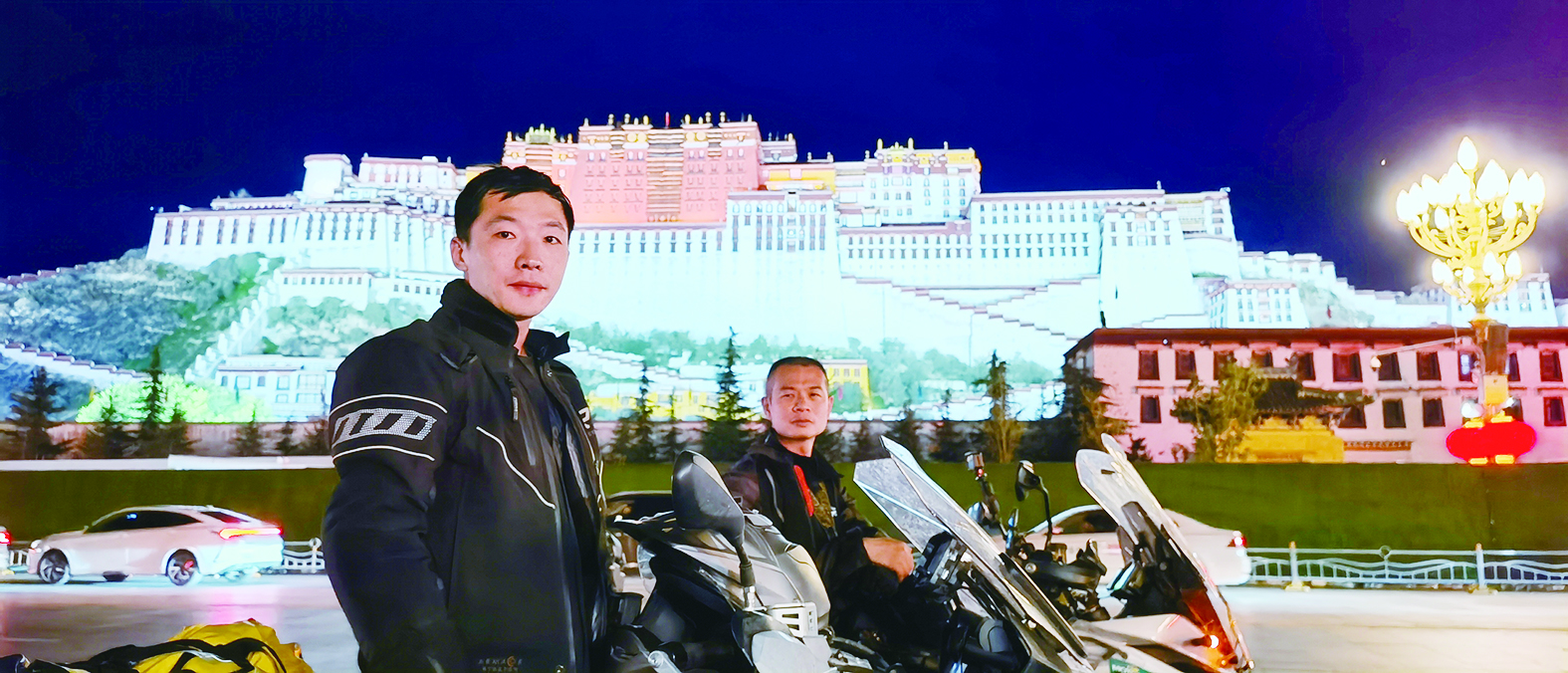 ▲宾国旭(前)与朋友骑行到达布达拉宫。受访者供图
