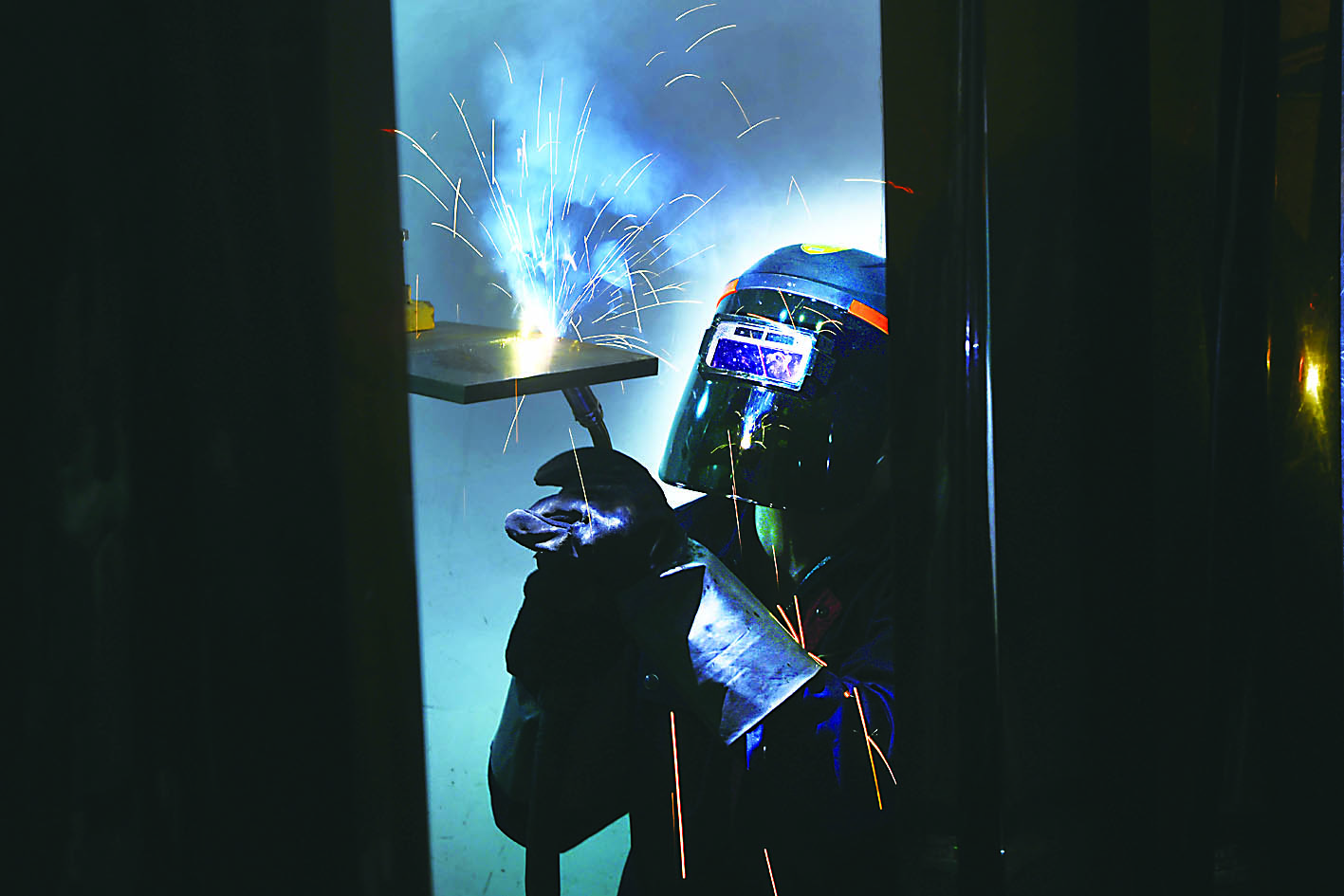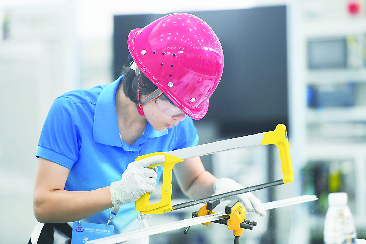 ▲电工项目赛场,女选手廖书琴专注地维修制作。