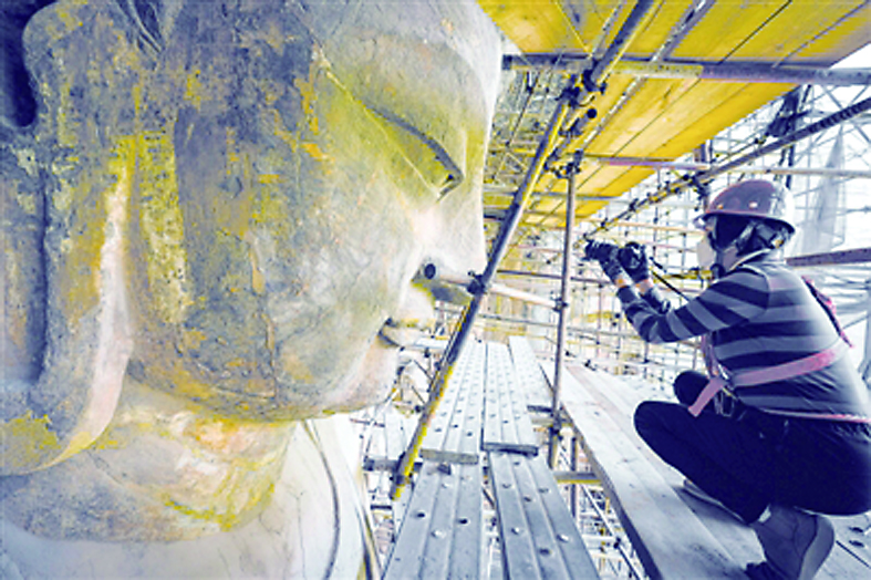 ▲研究人员在对龙门石窟卢舍那大佛进行调查。 视觉中国供图
