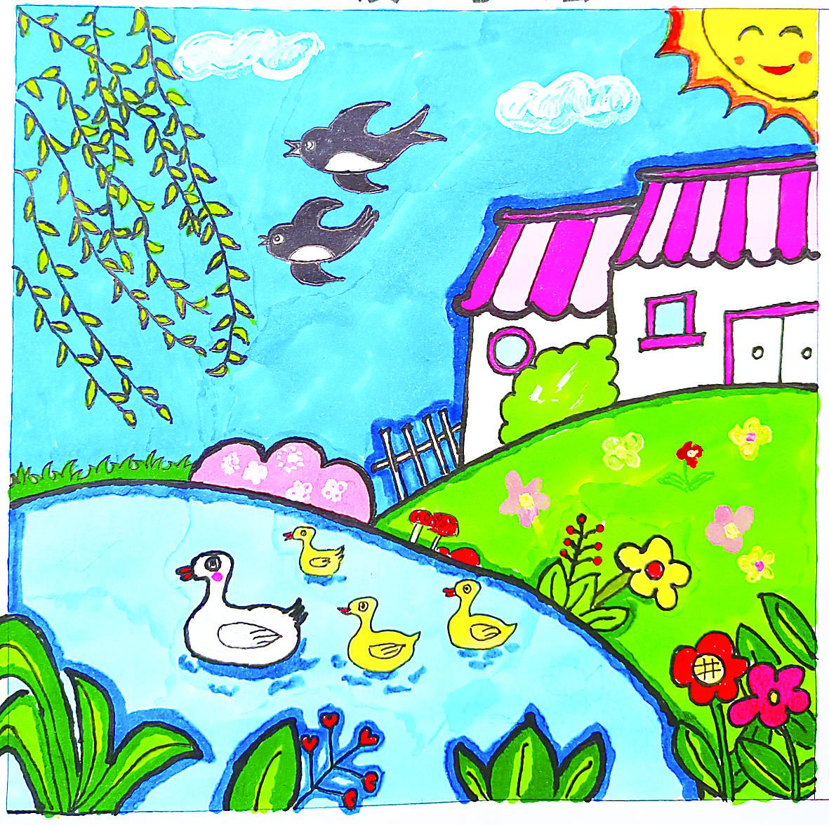 燕子说:春姑娘在柔和的东风里,裁出了嫩绿的柳叶。