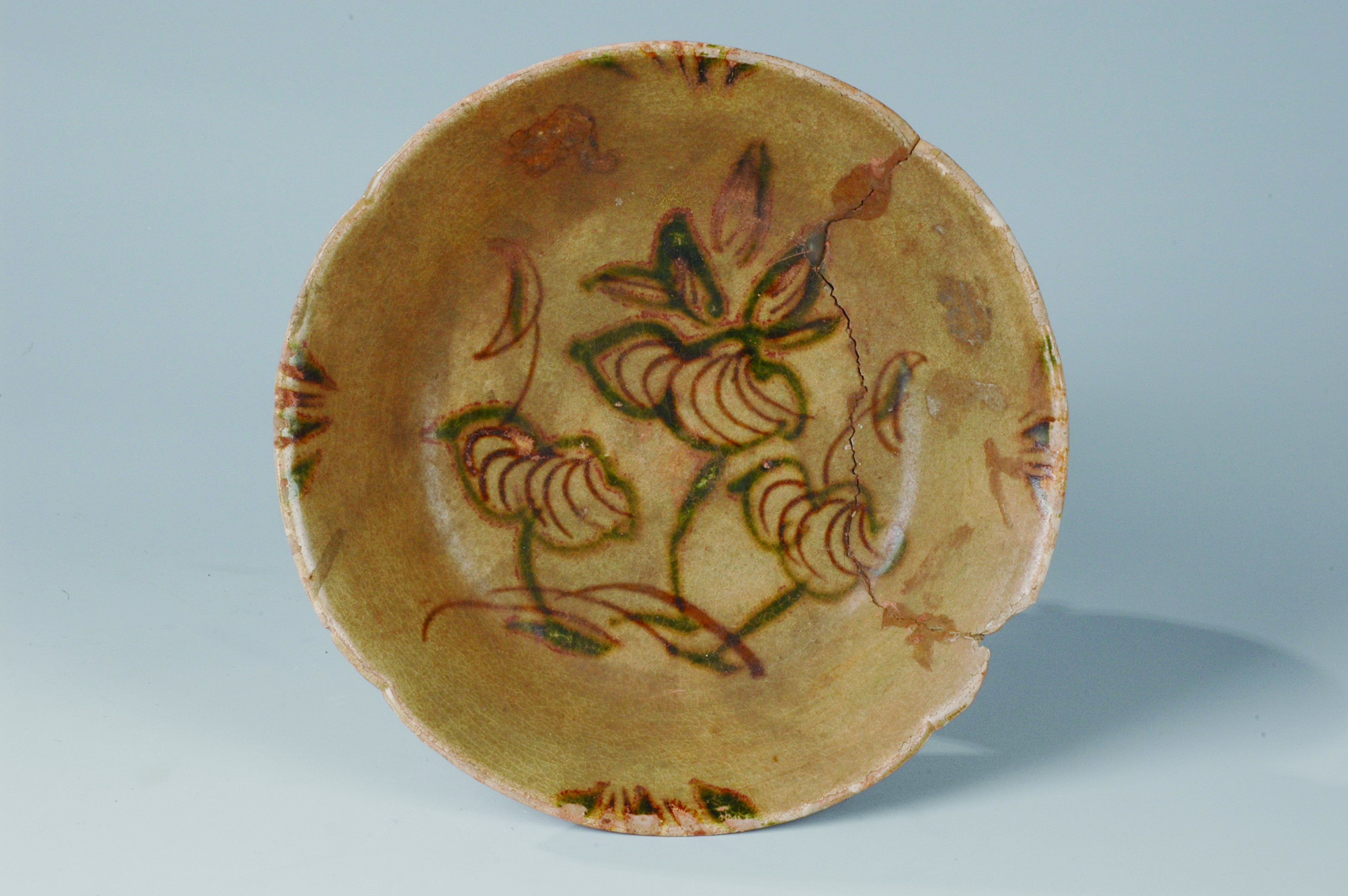 ▲醴陵出土的唐长沙窑青釉褐绿花卉纹碗。