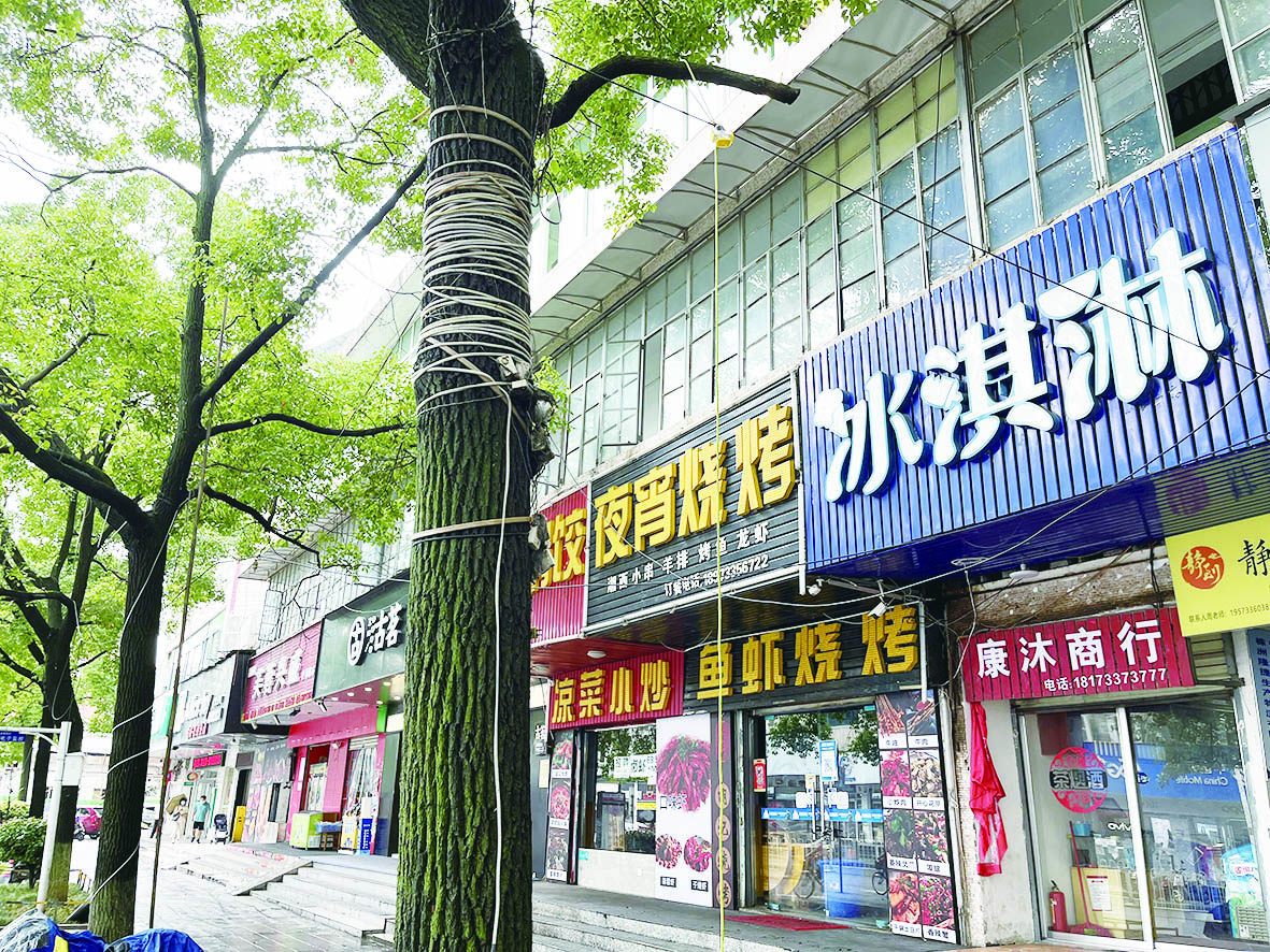 “晚上会闪闪发光的树,白天一看却是五花大绑!”7月8日,有市民在芦淞区株董路“山鹰商场”公交车站发现,路边多棵行道树上缠有灯带和电缆,挂有灯管;有插座挂在树上,可给电动车充电。记者现场核实发现,临街门面中有夜宵烧烤店,有电线从临街门面招牌下方伸出,架设到缠有灯带的行道树上。