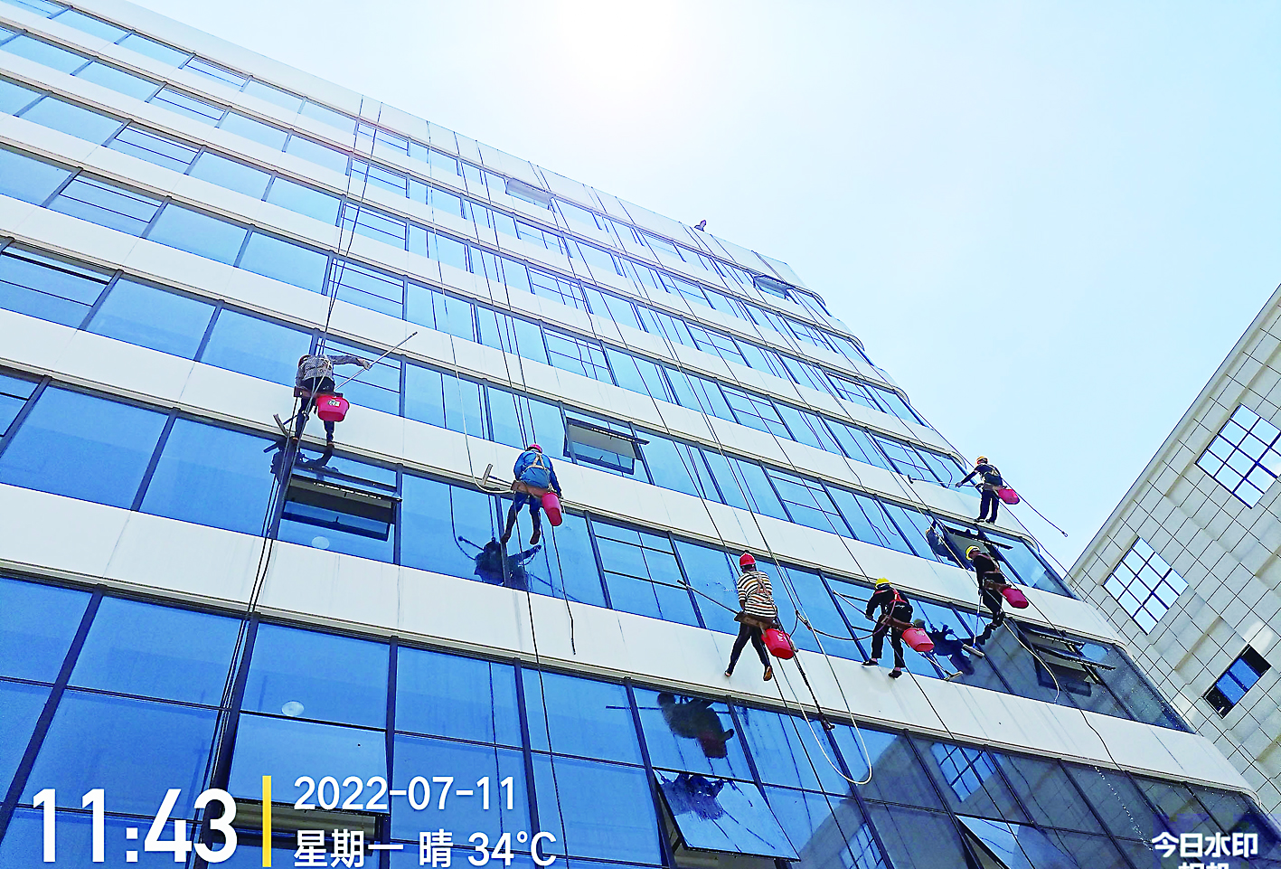 ▲“蜘蛛人”顶着烈日清洗高楼外墙。 记者/马文章 摄