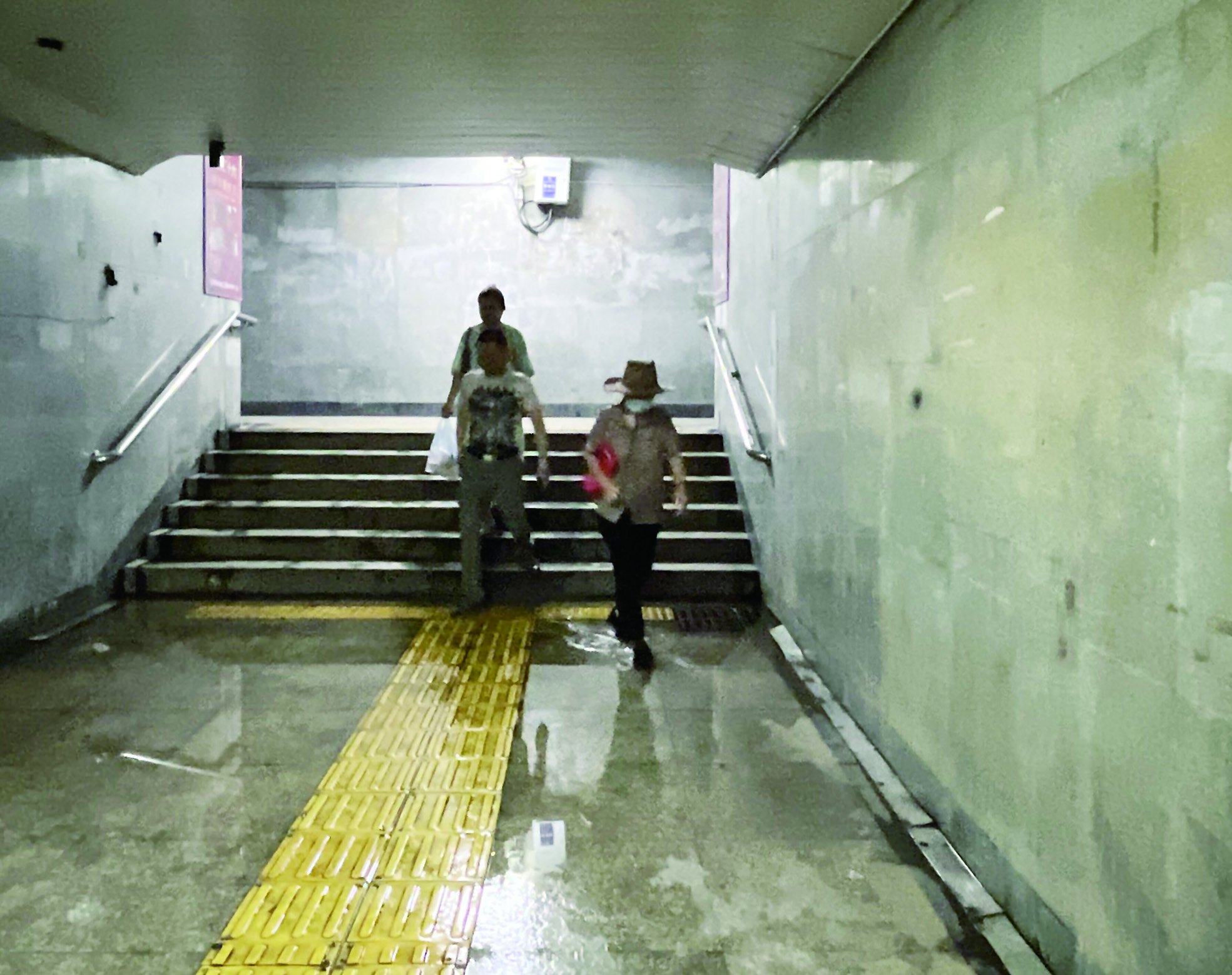 ◀7月10日,钻石路口地下通道,市民脚踩积水通行。 记者/刘平 摄