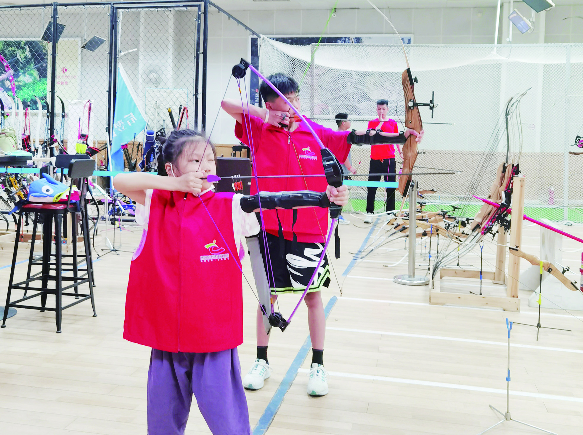 ▲一名小学生跟随教练进行射箭训练。 记者/戴凛 摄