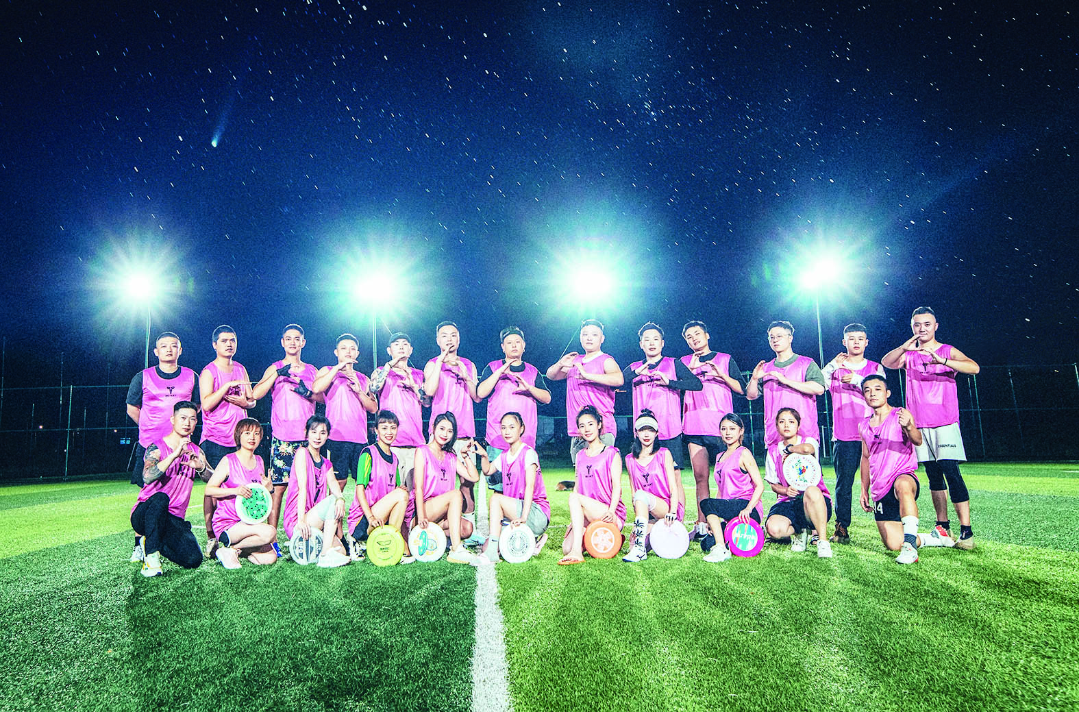 “往这里传!”“好盘!传得漂亮!”7月10日晚上8点,市体育中心运动场上,一场激烈的飞盘比赛正在上演。灯光下,两队人马不断组织攻防,跑动、跳跃、飞扑,只为把手中的飞盘精准地飞向队友,最终传至得分线。