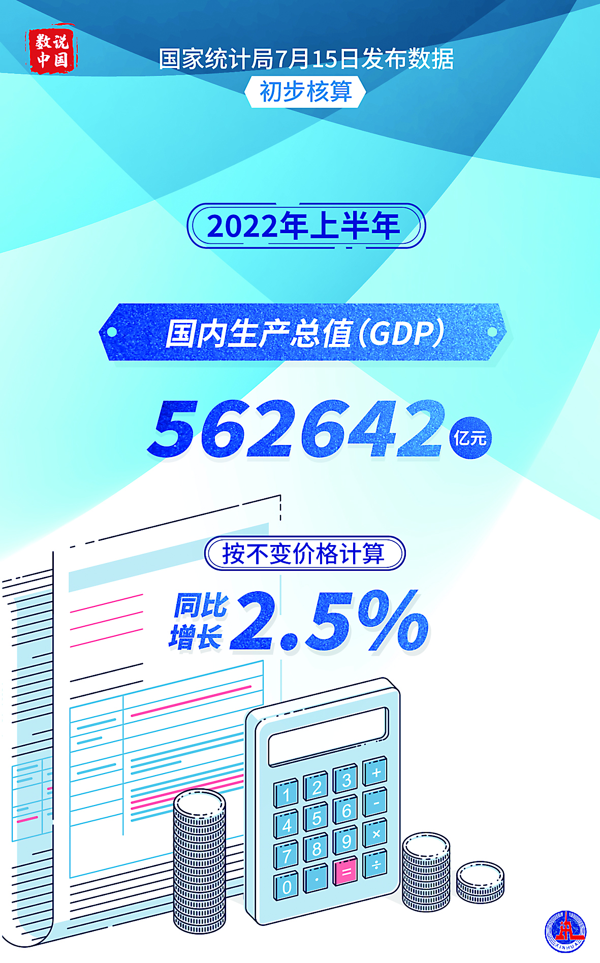 ▶初步核算,上半年国内生产总值(GDP)562642亿元,按不变价格计算,同比增长2.5%。 据新华社