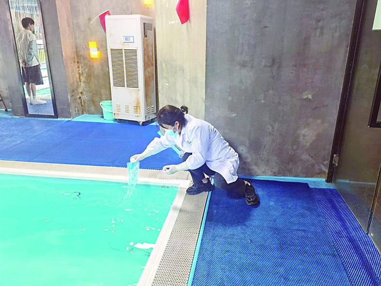 此次检查主要围绕两个方面,一是检查日常卫生管理情况,包括从业人员持证情况、卫生管理制度建立及完善情况、水质消毒情况、水质自检结果公示情况、循环水处理装置状态等,同时对游泳场所的水质进行全覆盖抽样检测;二是检查疫情常态化管理情况,督促各游泳场所做好日常清洁、通风和预防性消毒措施等,继续严格落实疫情防控措施并开展自查。对检查中发现的问题,执法人员要求游泳场所立即整改。