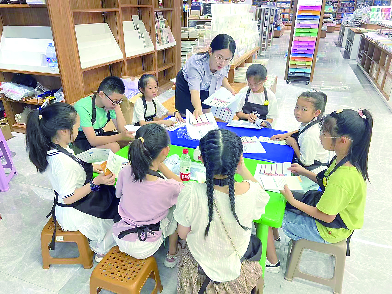 ▲7月18日,天元区方唯书店里,2022年暑假社会实践活动“我是小小图书管理员”吸引了孩子们参加。通过网络报名,来自市区的小学生们系上管理员围裙,现场学习辨别非法出版物、“扫黄打非”的相关知识,并在“绿书签”上写下自己对阅读正版阅读物的认识和支持。图为工作人员正在教孩子们辨别正版读物。 株洲晚报融媒体记者/谭昕吾 摄影报道