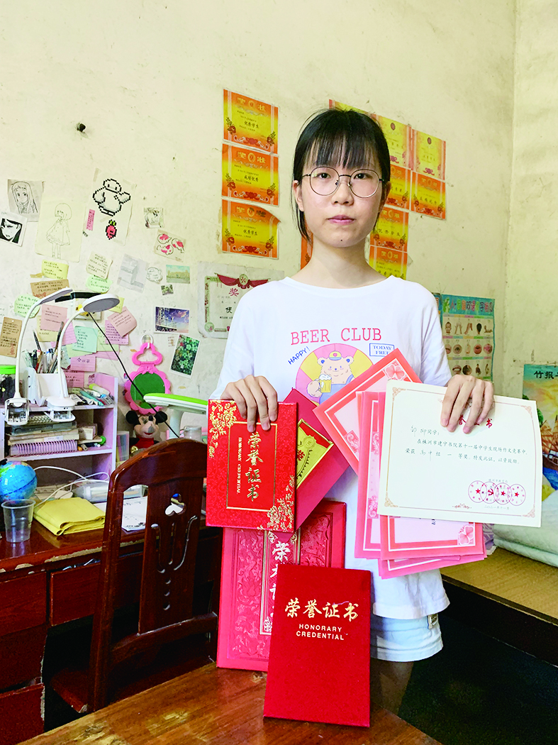 走进小邹的房间,墙上贴满了奖状,书桌上的字帖散发出油墨的香味,床头摆了好几本小说。
