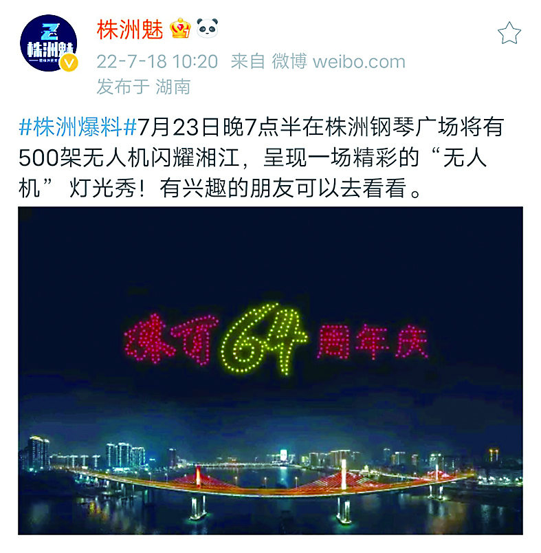 7月23日晚7点半,在株洲钢琴广场将有500架无人机闪耀湘江,呈现一场精彩的“无人机”灯光秀!有兴趣的朋友可以前往现场一睹为快。