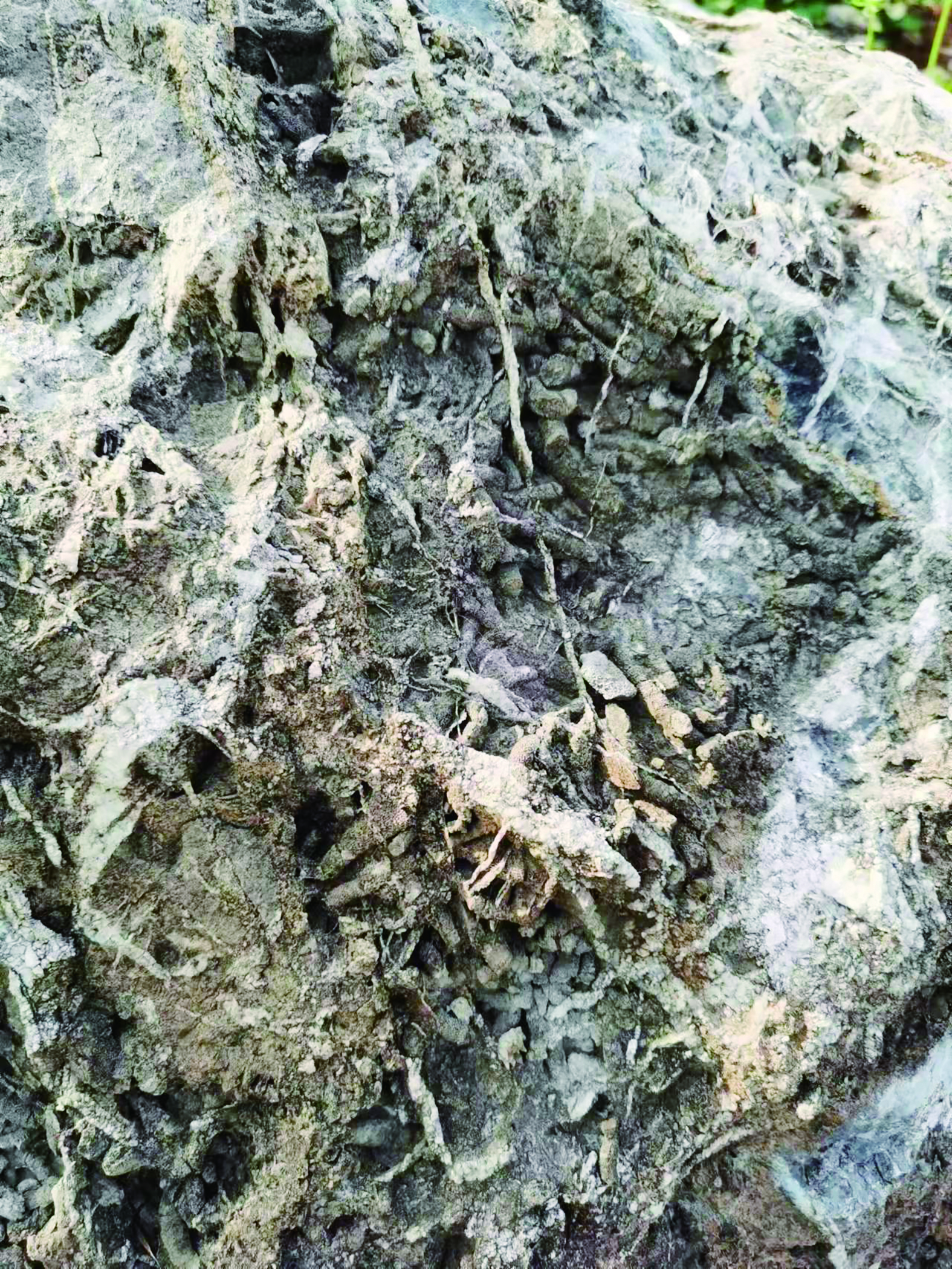 7月19日,记者根据张先生所述,来到长郡云龙实验学校附近一处工地,看到了张先生所述的远古化石,石头高约半个成人、宽50厘米左右;石头表面布满树根一样的东西,一掰即断。张先生指着自己从石头上摘下来的海螺和“树根”样品推测,“这两样东西应是远古化石”。