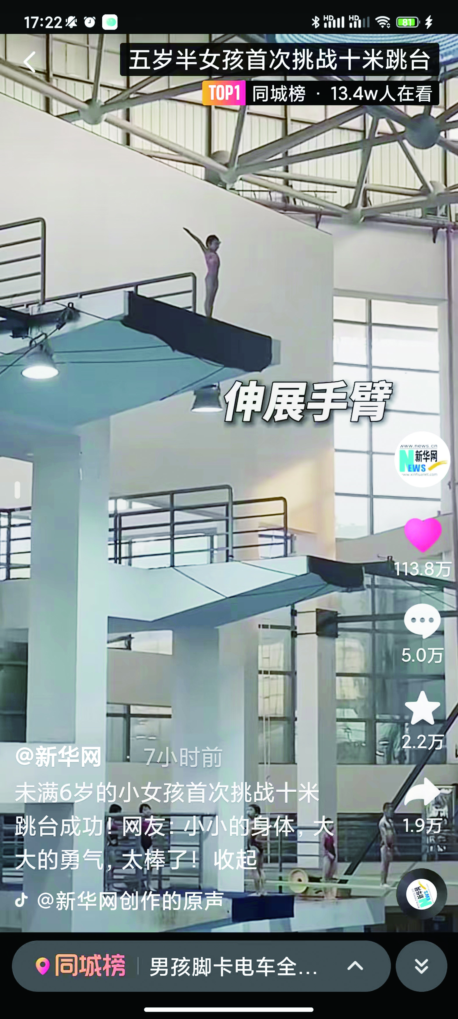 7月19日晚,“直播株洲”抖音号和视频号发布了《5岁半女孩初登十米跳台 看她如何克服内心恐惧 一跳成功》的短视频,引发网友关注。一时间,这条视频已占据抖音株洲同城榜第一名。7月20日上午9:32,新华网抖音号也对这条视频进行了转载发布并置顶,引来众多网友点赞、留言,截至当日17时,点赞超110万,留言超5万。大家都被这位小女孩的勇气所打动,称赞她是“下一个全红婵”。同一天,众多媒体抖音号也进行了转载发布。