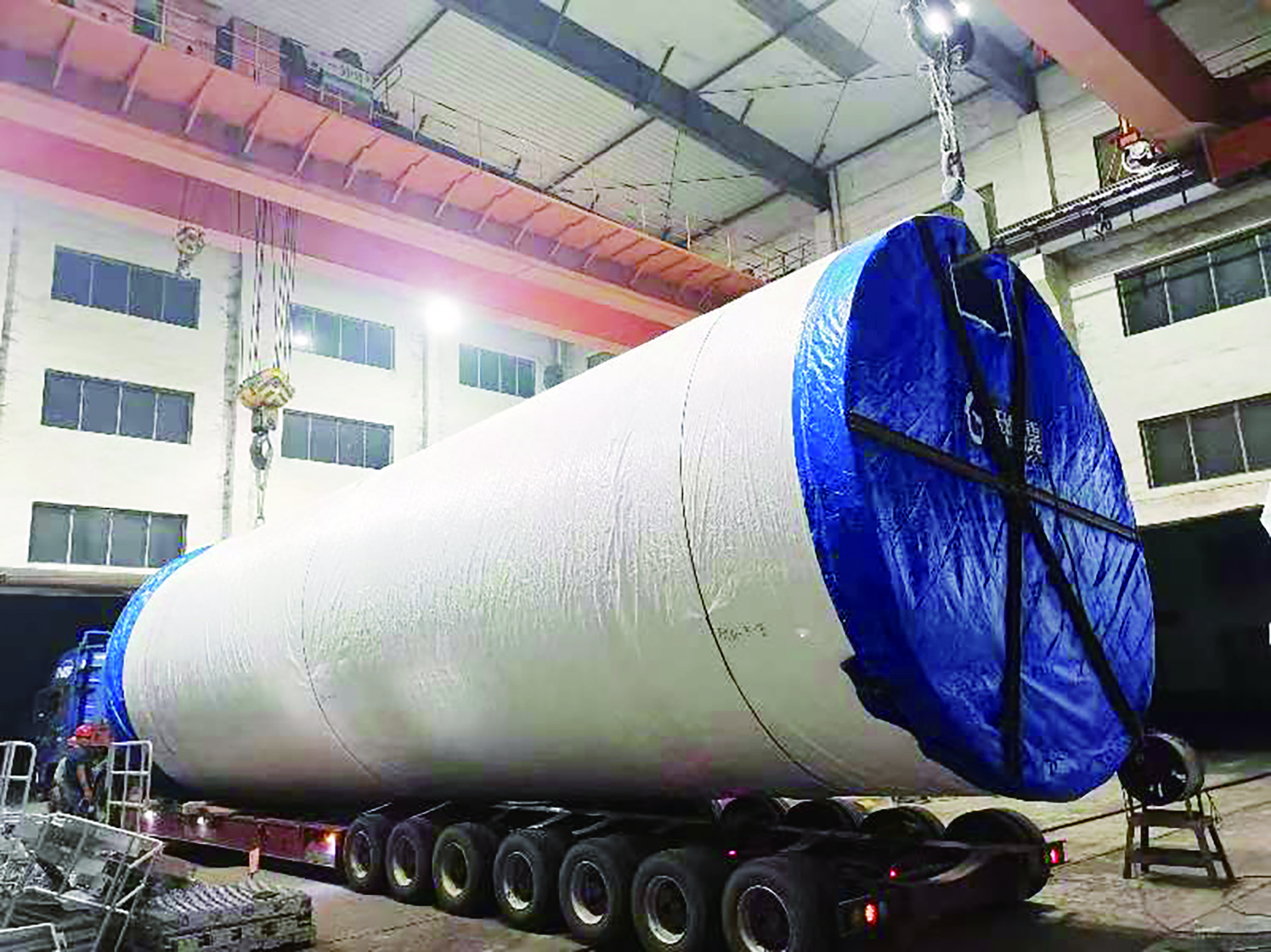 ▲天桥起重生产车间内,正在装运的风电塔筒。企业供图