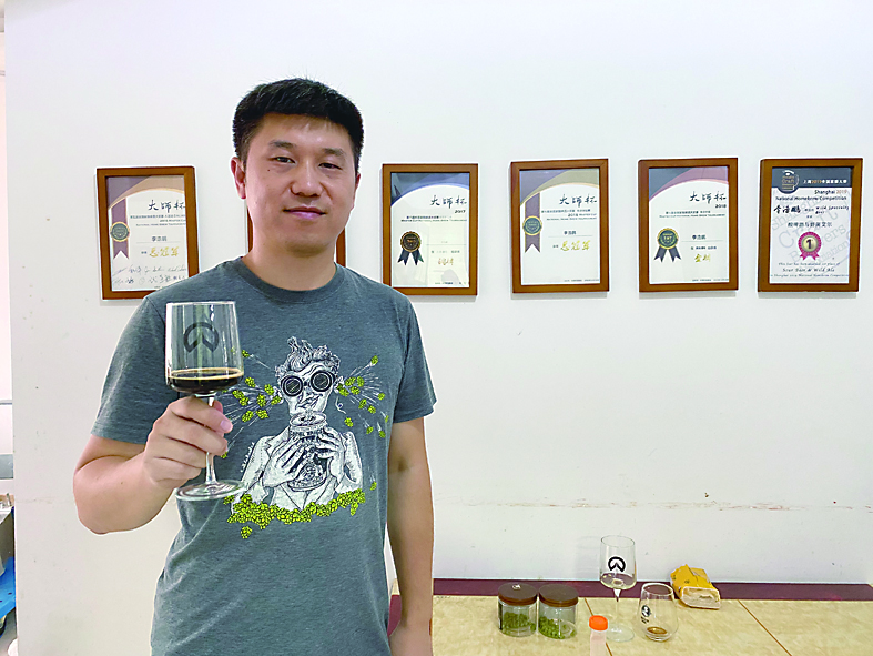 ◀李浩鹏和他的自酿黑啤。 记者 旷昆红/摄