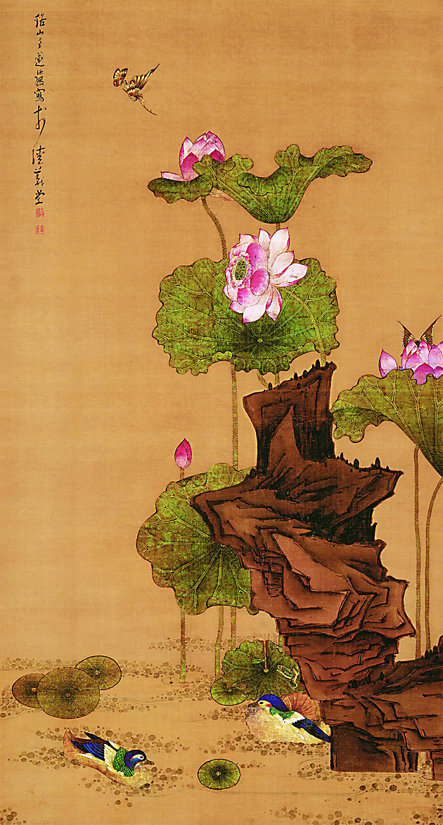 陈洪绶(1599—1652),字章侯,幼名莲子,一名胥岸,号老莲,别号小净名,晚号老迟、悔迟,浙江诸暨市枫桥镇陈家村(今浙江省诸暨市枫桥镇陈家村)人。明代著名书画家、诗人。 画中为荷塘一角,芦苇丛生,清澈见底的水面上,一对鸳鸯相伴而游,在它们上面荷叶碧绿似伞,几朵红荷正绽吐芳菲。花鸟画法工整细致,虚实相合。荷叶的脉络、荷花的红丝及荷柄之上的细刺都描绘得极其生动,而水波、水草、芦苇只以淡墨数笔勾染而成。笔法虚实结合,使画面呈现一种空灵润泽的感觉。