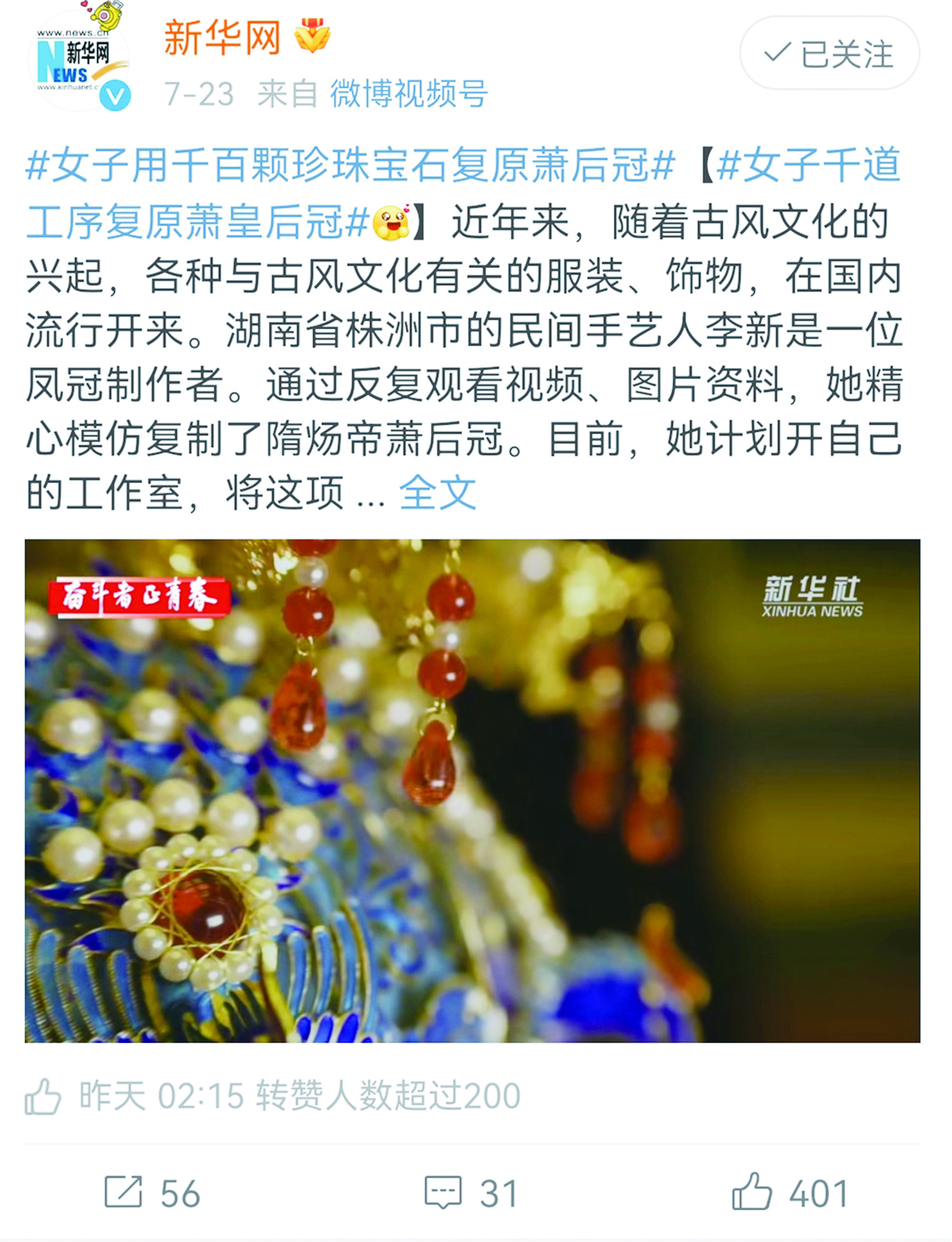 近年来,随着古风文化的兴起,各种与古风文化有关的服装、饰物,在国内流行开来。湖南省株洲市的民间手艺人李新是一位凤冠制作者。通过反复观看视频、图片资料,她精心模仿复制了隋炀帝萧后冠。目前,她计划开自己的工作室,将这项手艺传承下去。
