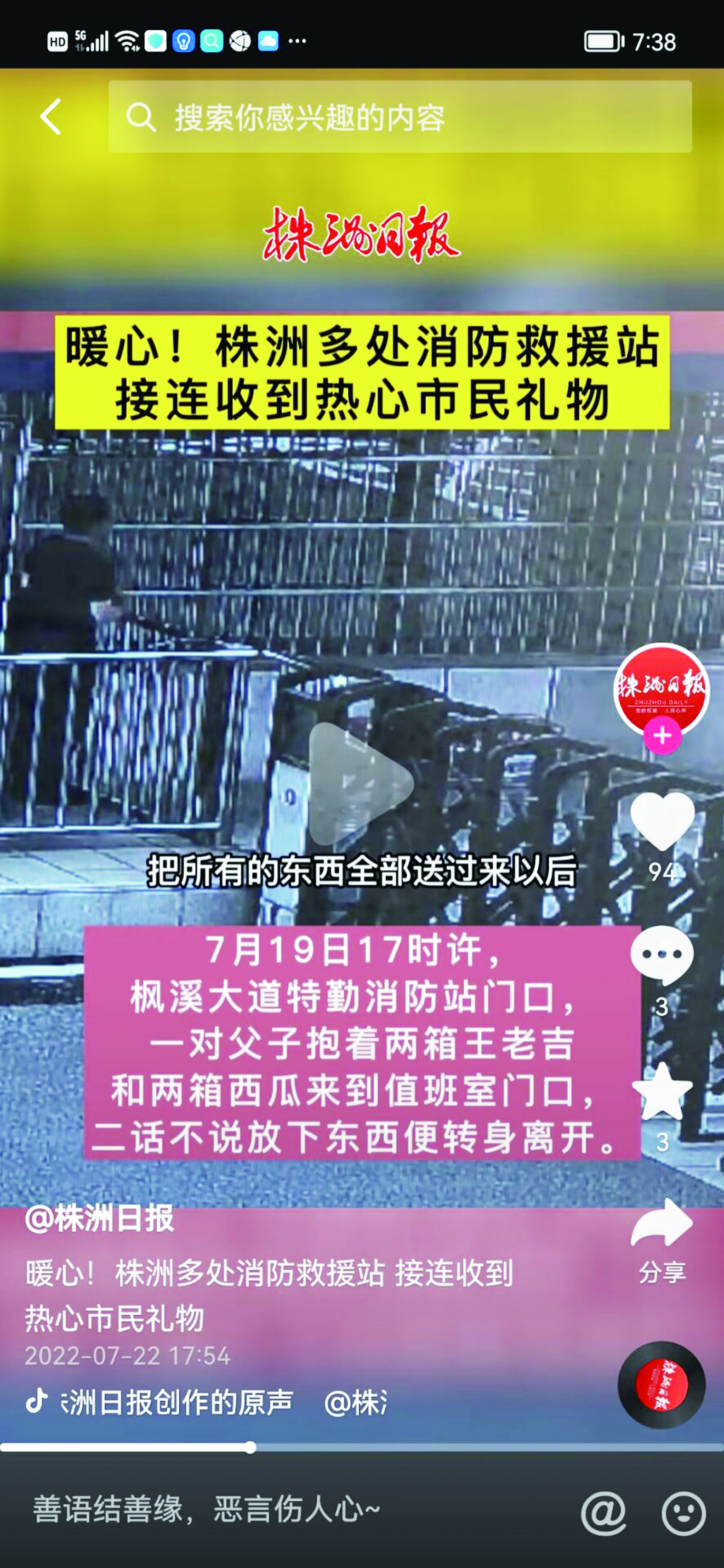 最近天气炎热,在株洲,这一暖心之举时有发生。热心市民的举动,让消防员们心里暖暖的。