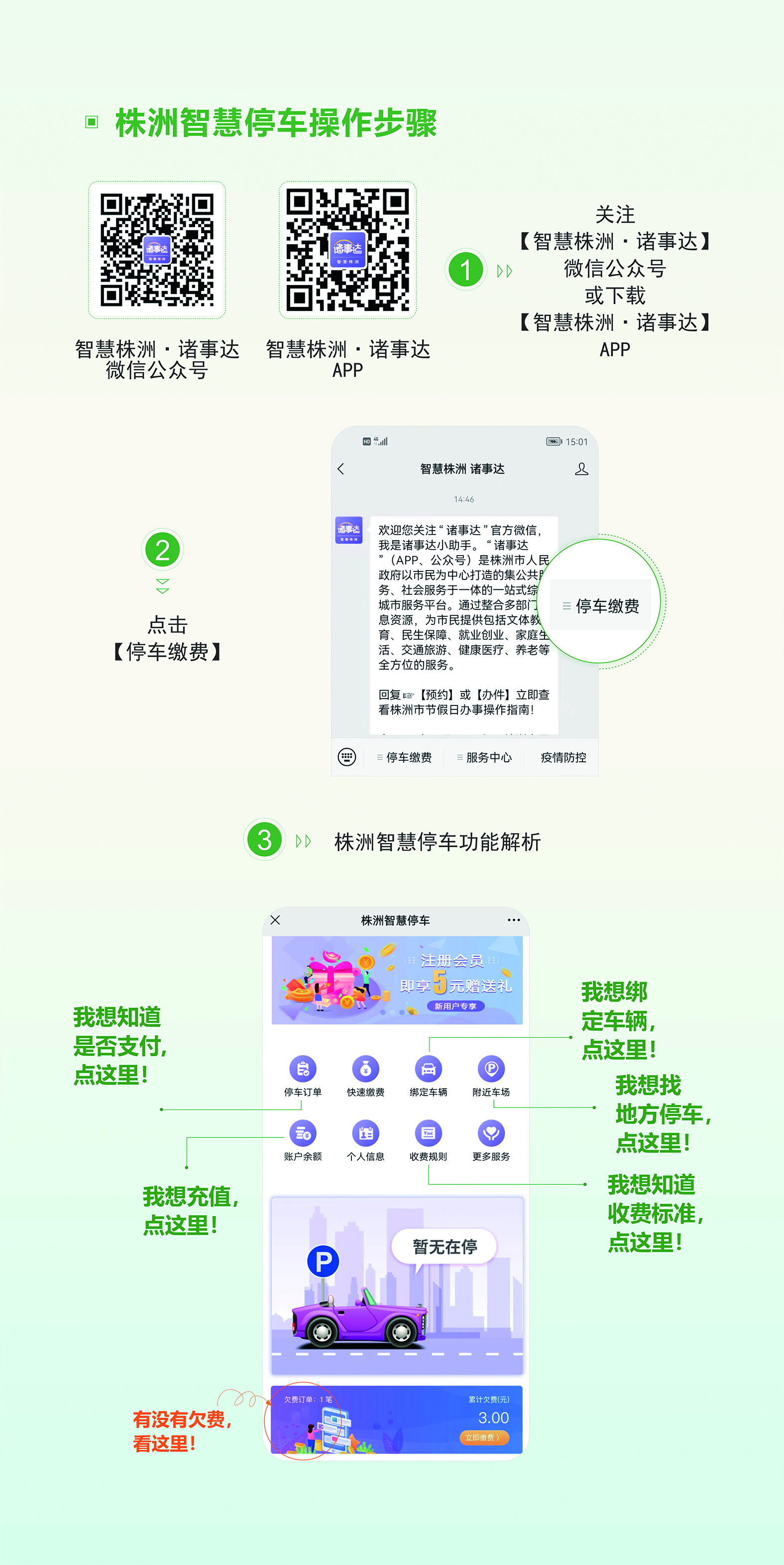 城区道路临时停车泊位第三期智慧停车和第二期操作相同,手机操作即可。车主可通过微信扫码关注“智慧株洲·诸事达”微信公众号或下载“智慧株洲·诸事达”App,进入登录界面,根据提示可以查询附近停车场、账户余额、优惠信息、停车订单,修改个人信息,实施缴费操作等。绑定车辆信息后,停车可实现快速缴费。具体操作如图所示。