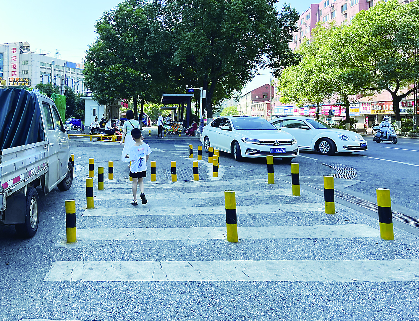 记者现场核实发现,隔离桩超过20根,其中有8根隔离桩与斑马线的白色线条有重叠;有一排较密集的隔离桩与斑马线白色线条平行安装,并挡住一大半斑马线;部分隔离桩之间的间距较窄,连电动车、摩托车、婴幼儿车都无法通过。
