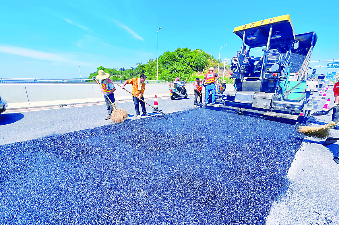▲渌口大桥上,市城管局市政工程维护中心的队员们“趁热”摊铺沥青。记者/伍靖雯 摄