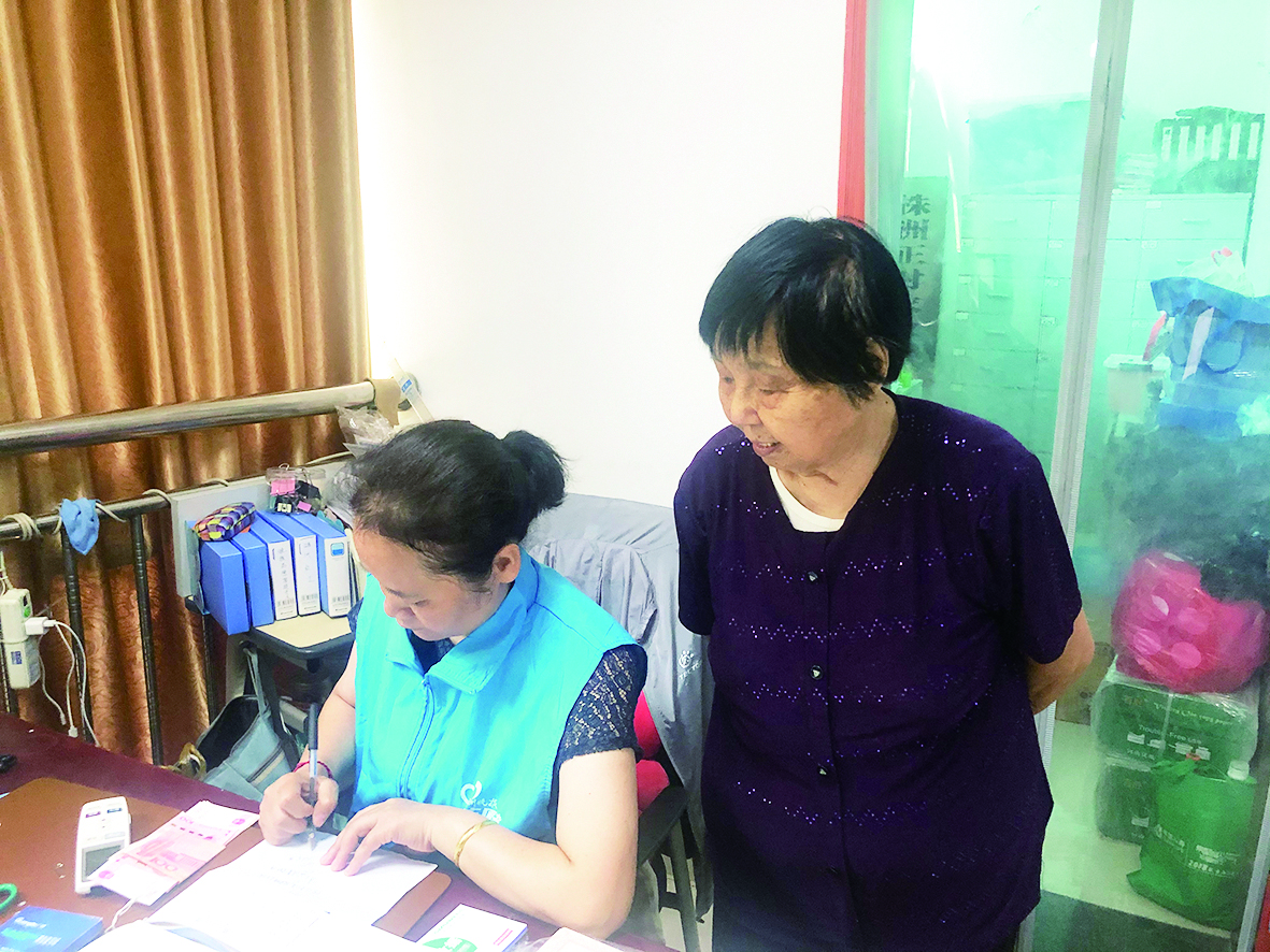 ▲27日,袁玉清捐助学金,志愿者李咏梅为她开具收据。记者/郑炜青 摄