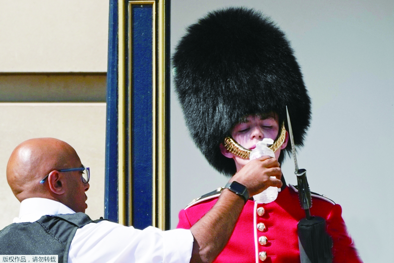 ▲在气温首次突破40摄氏度导致火灾激增后,英国首都伦敦于7月19日宣布进入“重大事件”状态。图为女王皇家卫队的成员在高温天气里站岗,工作人员上前给他喂水。