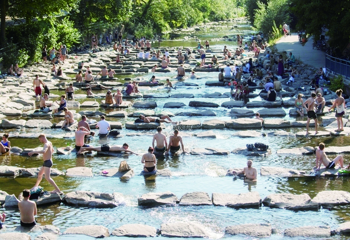 ▲德国一条顺势而下的河流里坐满了乘凉的人群。