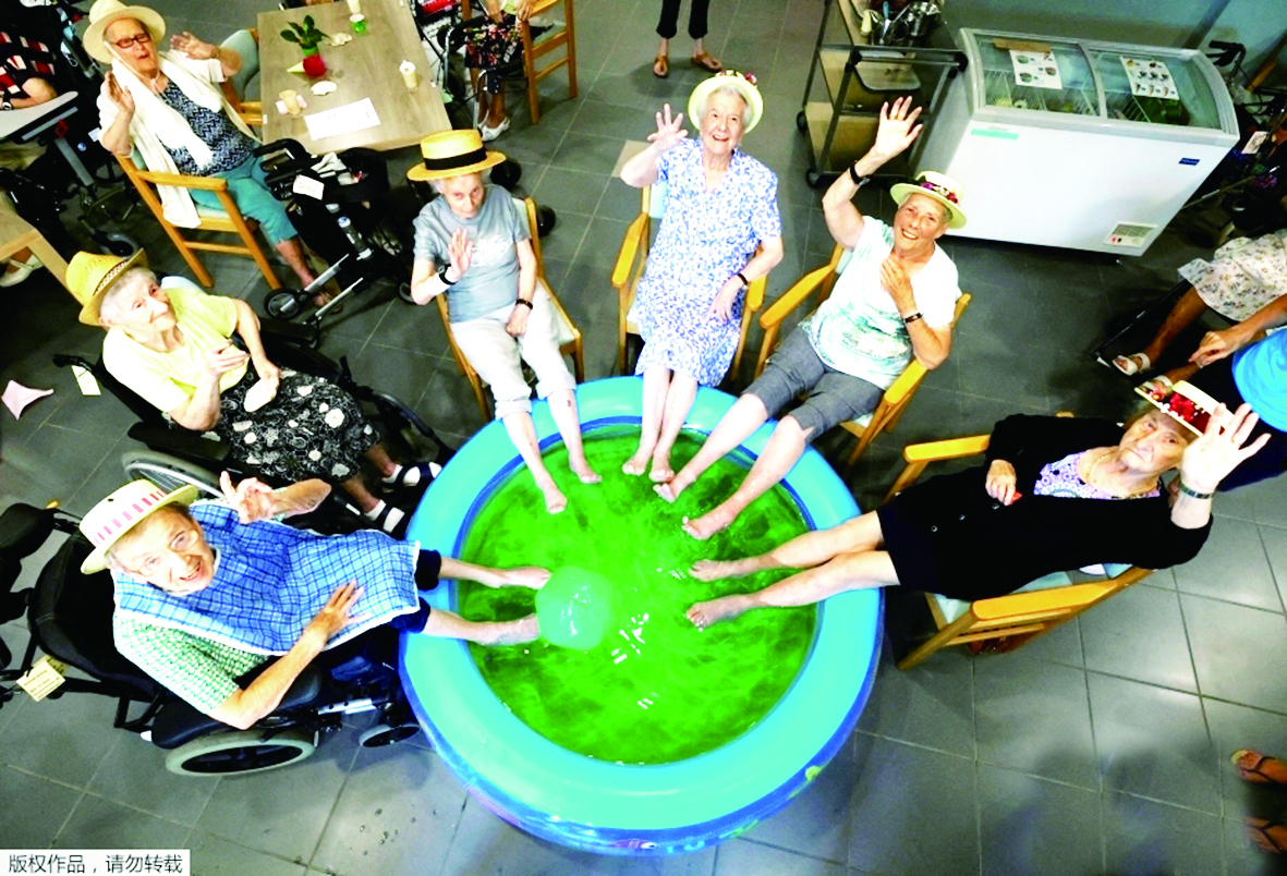 ▲比利时一家老人院为了让老人们在高温天气感到舒适,用装满冰水的大盆泡脚降温。