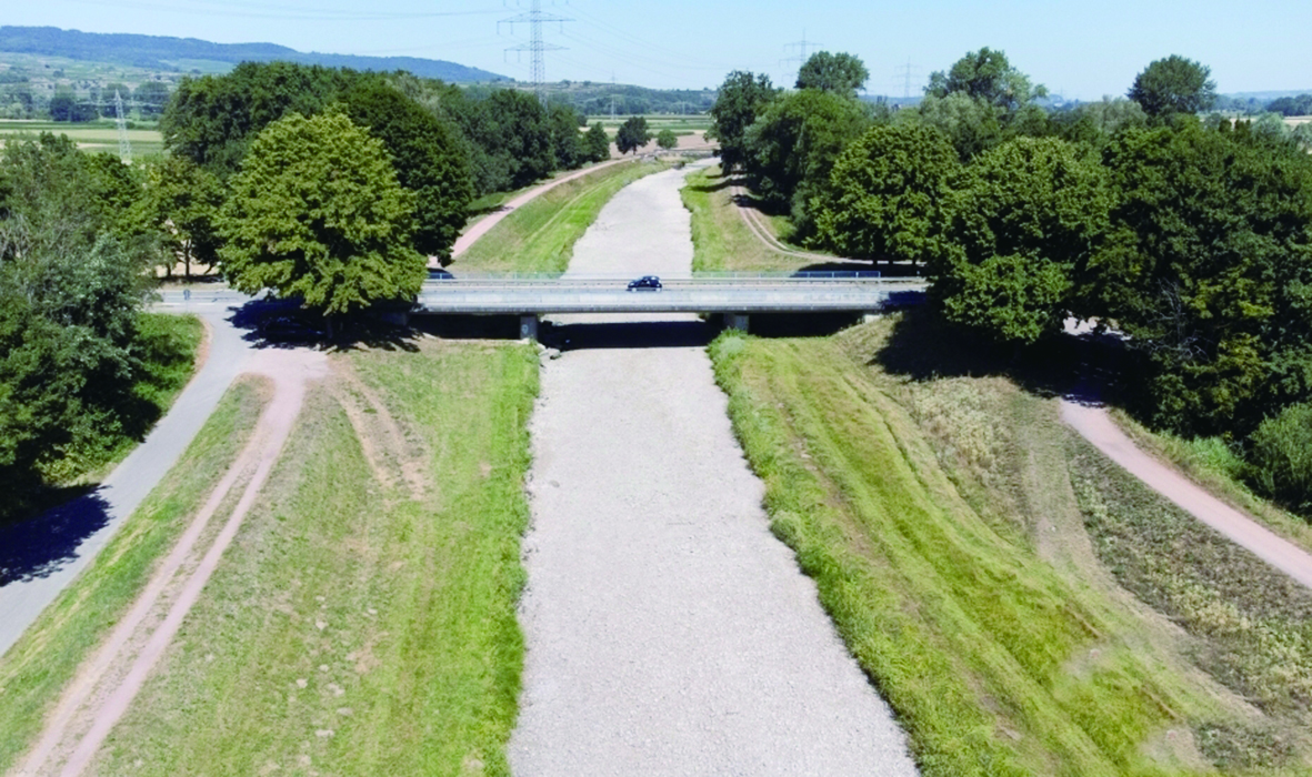 ▲一辆汽车行驶在德国郊外的一座桥上,桥下原本流淌的河水已经完全晒干变成裸露的陆地。