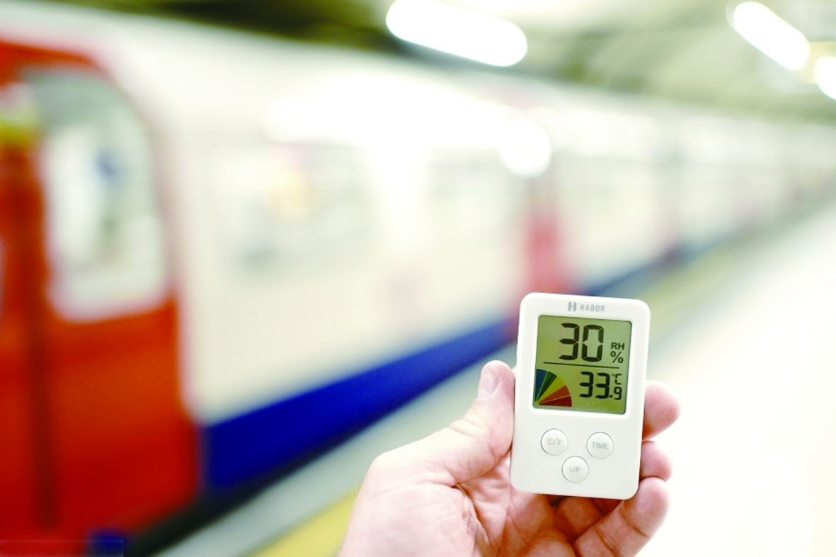 ▲即便是在地铁里也不凉快。拿着温度计站在伦敦地铁里,数字显示为33.9摄氏度。