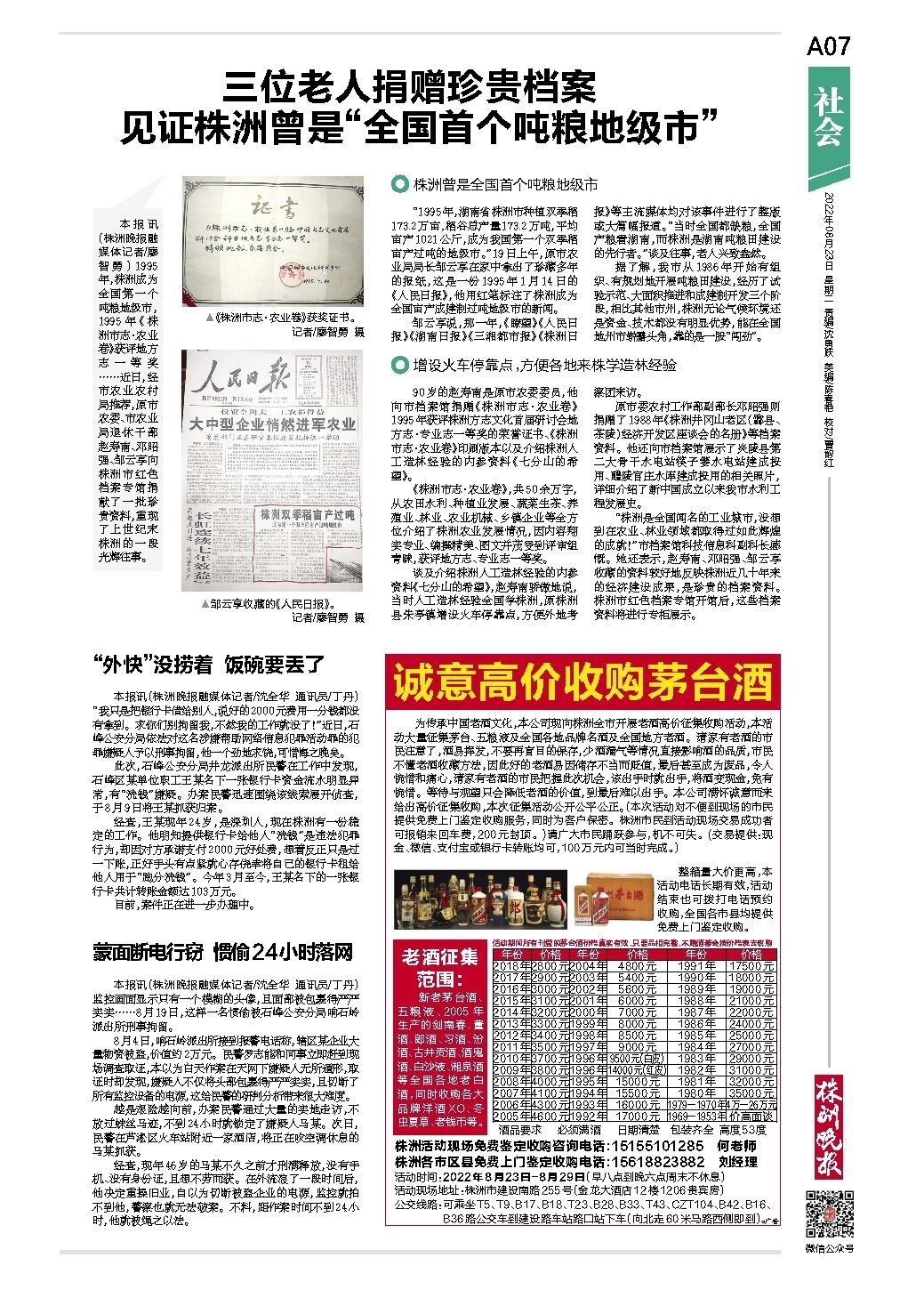 三位老人捐赠珍贵档案 见证株洲曾是“全国首个吨粮地级市”