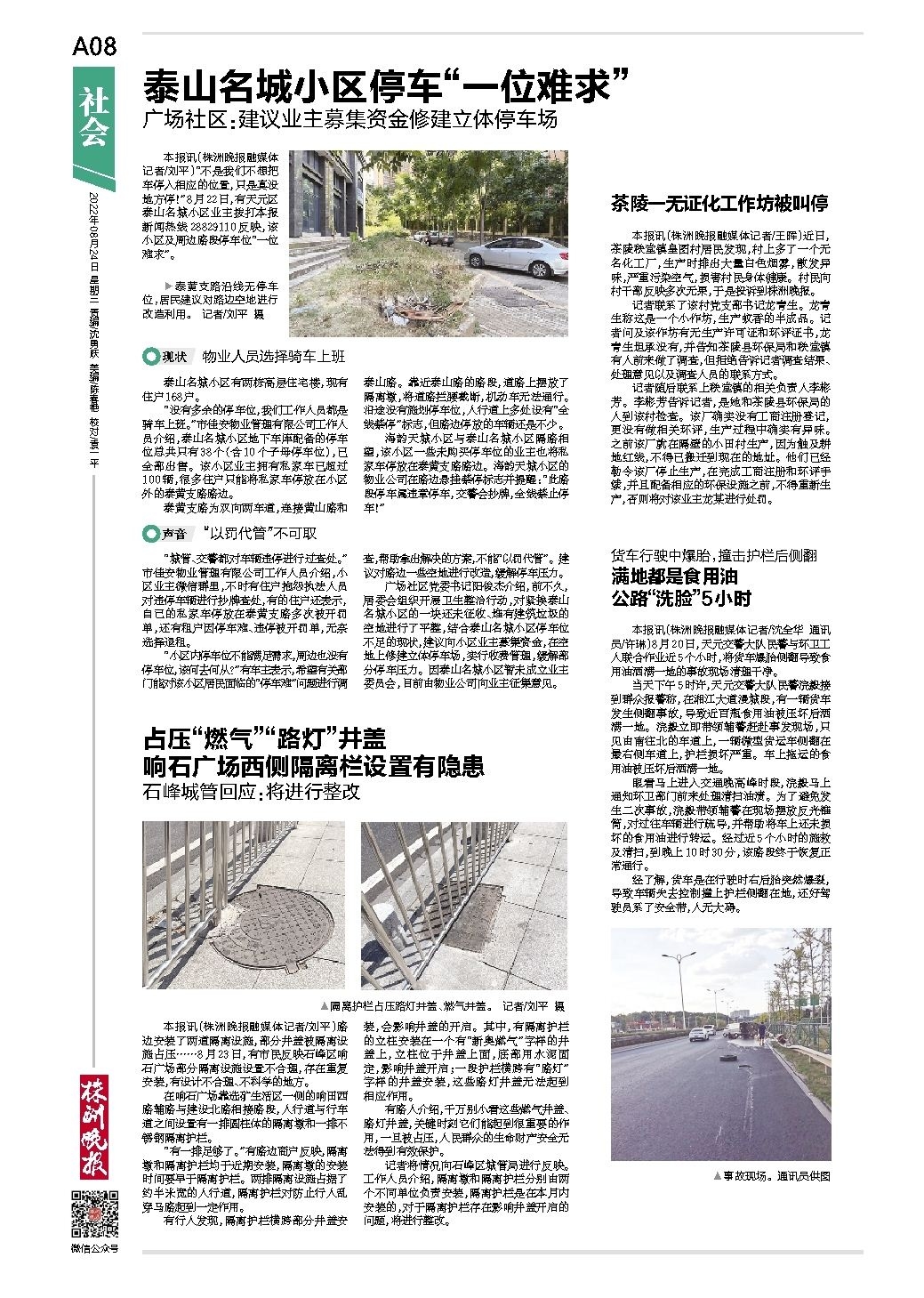 占压“燃气”“路灯”井盖响石广场西侧隔离栏设置有隐患