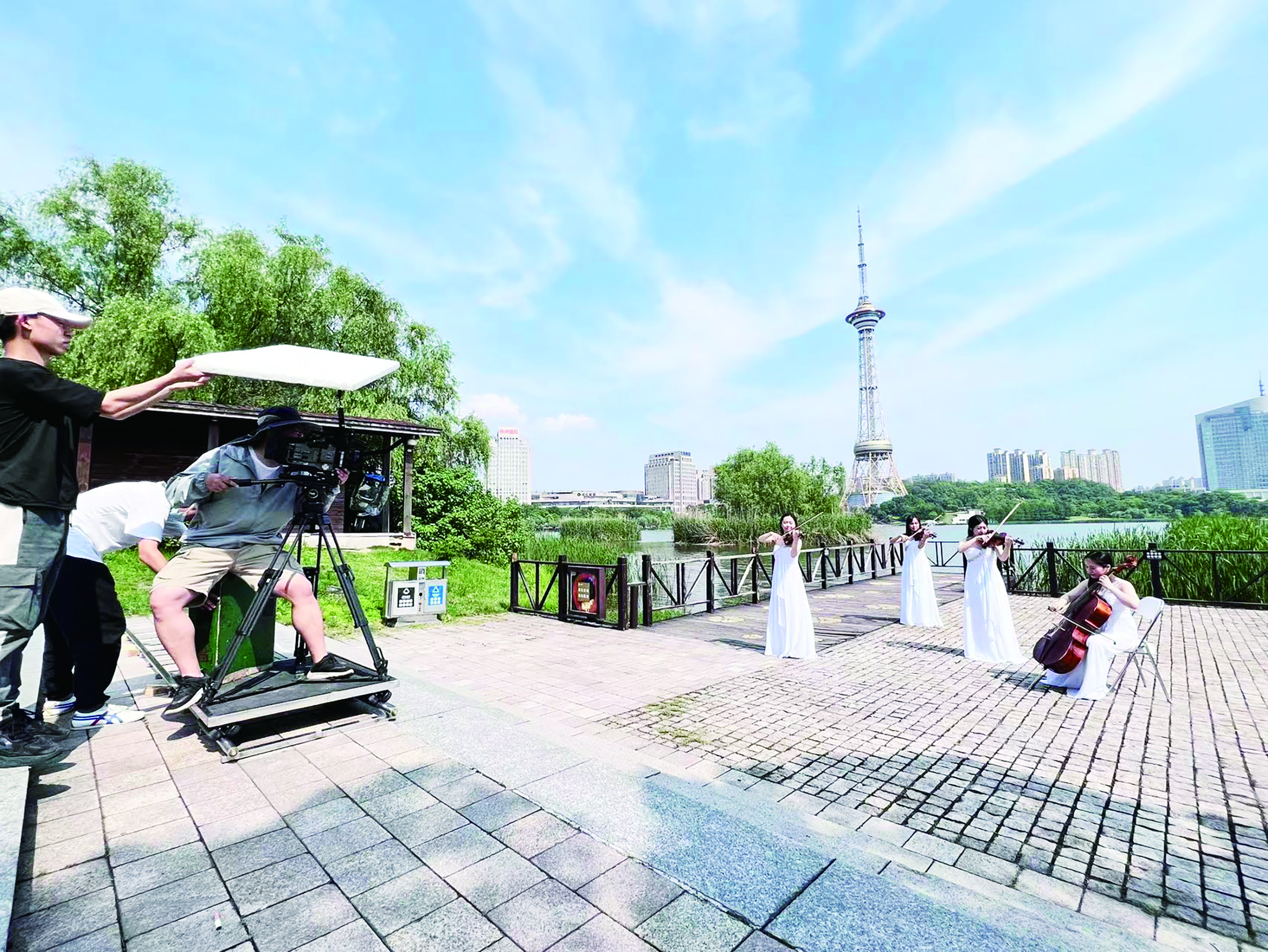 ▲烈日下,《很高兴认识你》摄制组在神农湖取景。 通讯员供图