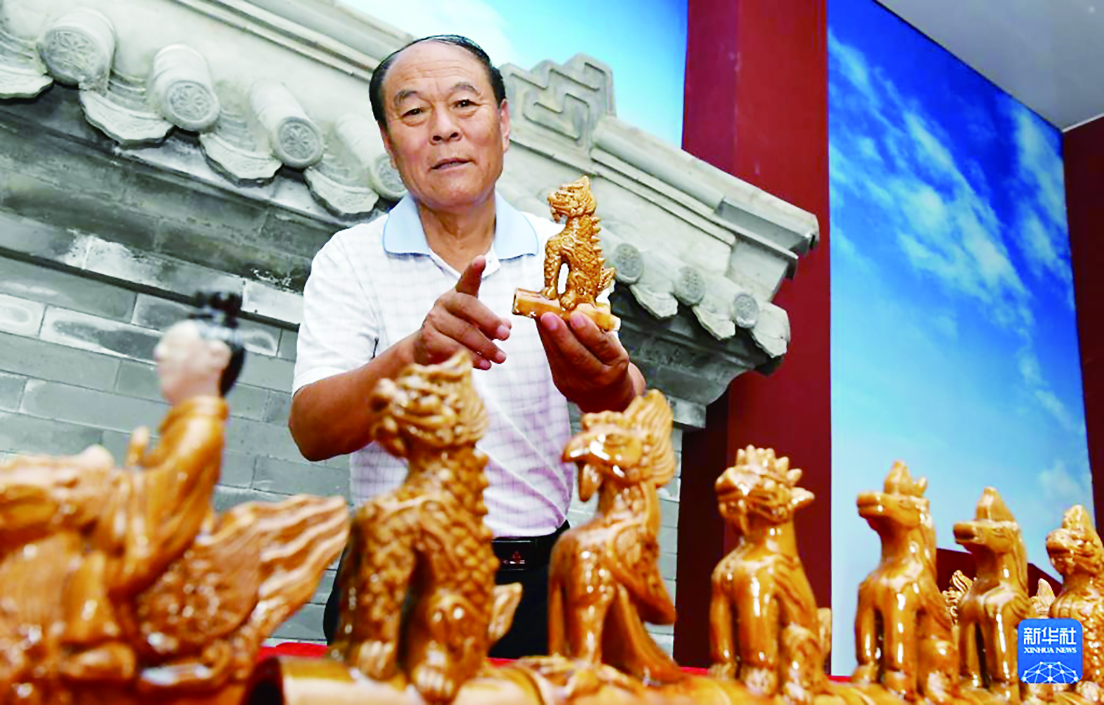 7月22日,古建青砖制作技艺代表性传承人王立山介绍琉璃走兽系列摆件。