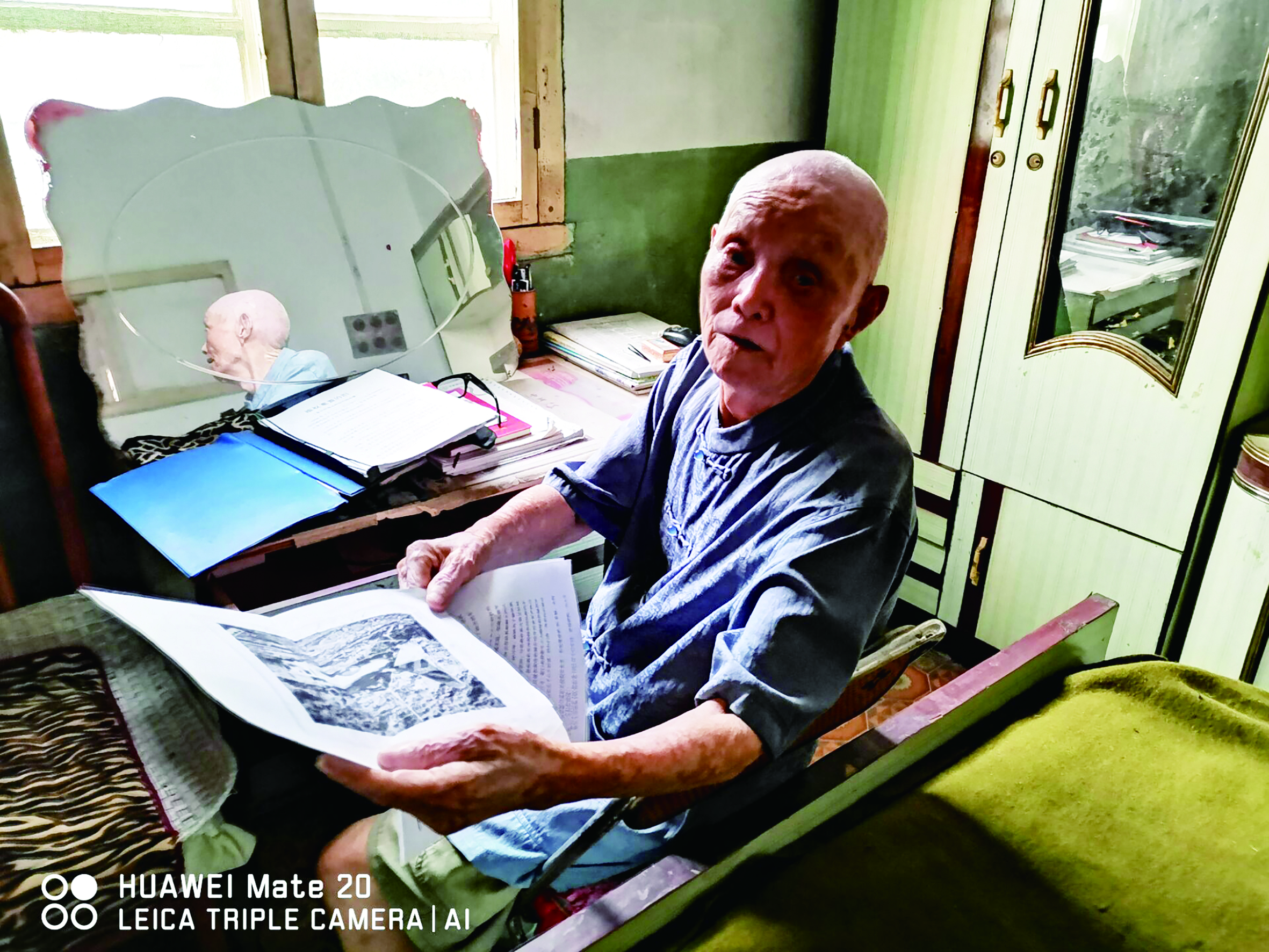 ▲葛老手里的照片,是当年击落的一架美国F80飞机。记者/沈勇跃 摄