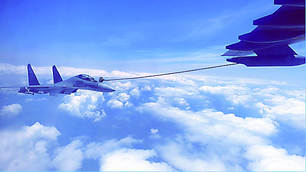 ▲空军运油-20和歼-16飞机开展海上方向空中加油训练(资料图)。新华社发