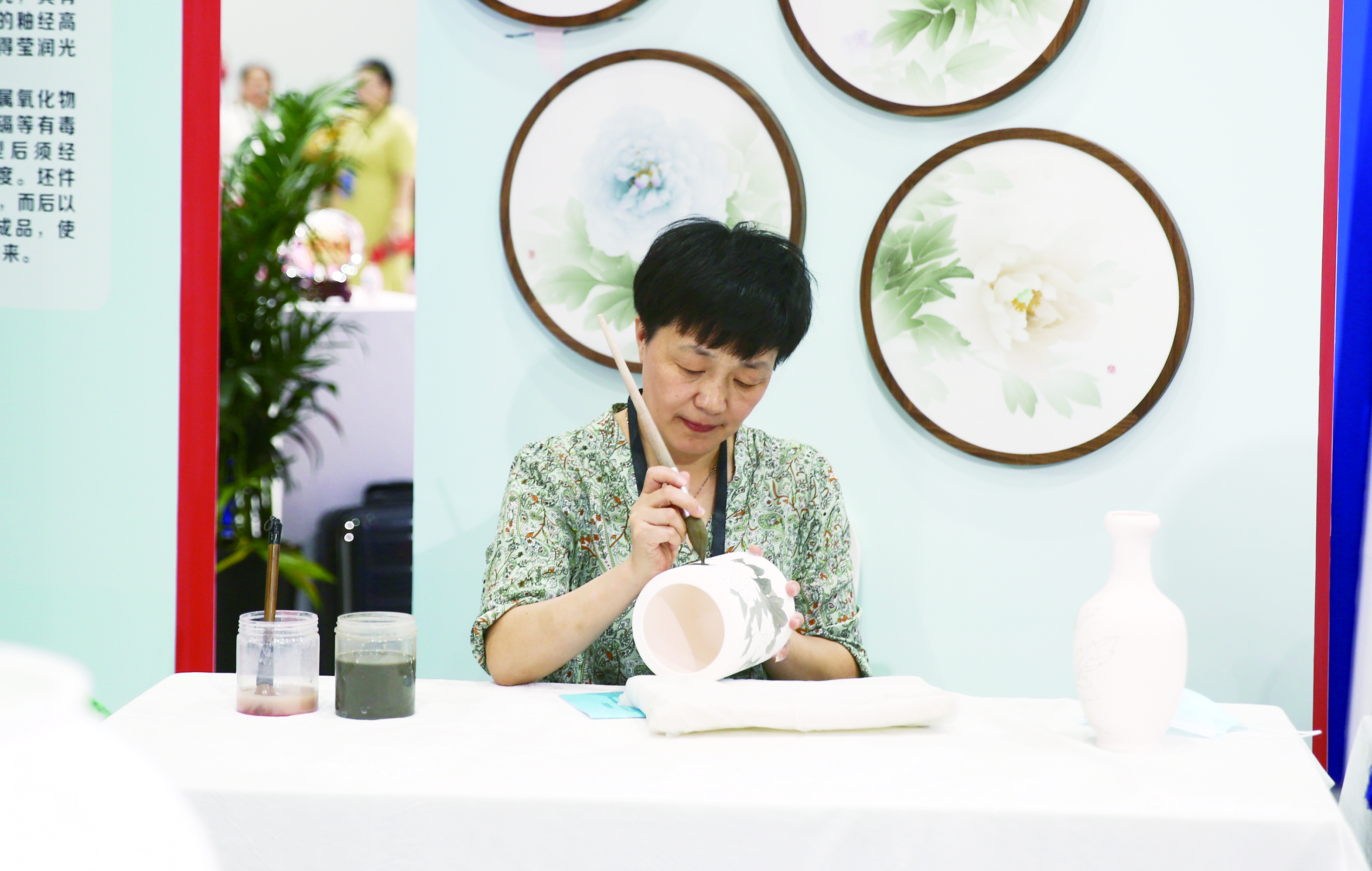 在以“湘遇疆来”为主题的湖南非遗展厅内,“醴陵釉下五彩瓷烧制技艺”是代表性项目之一,此次参展的作品以陈扬龙家族“薄施淡染”工艺所制的精品力作为主。据陈利介绍,“薄施淡染”工艺繁复且周期漫长,让醴瓷从原来大红大绿、类似于唐代的审美转换成清雅、素淡的宋瓷美学。