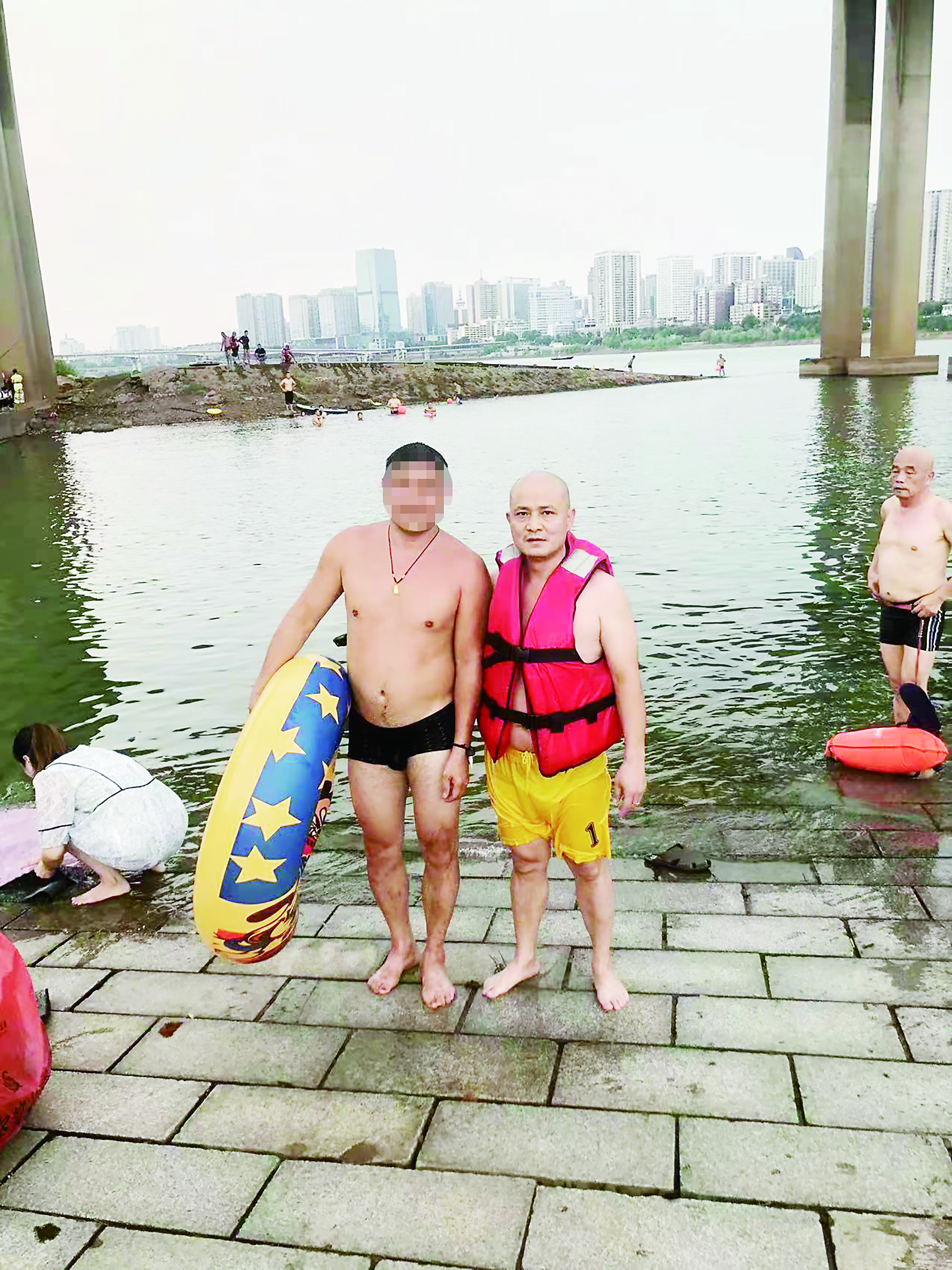 ▶张卫华(右)与获救男子在江边合影。湘江救协供图