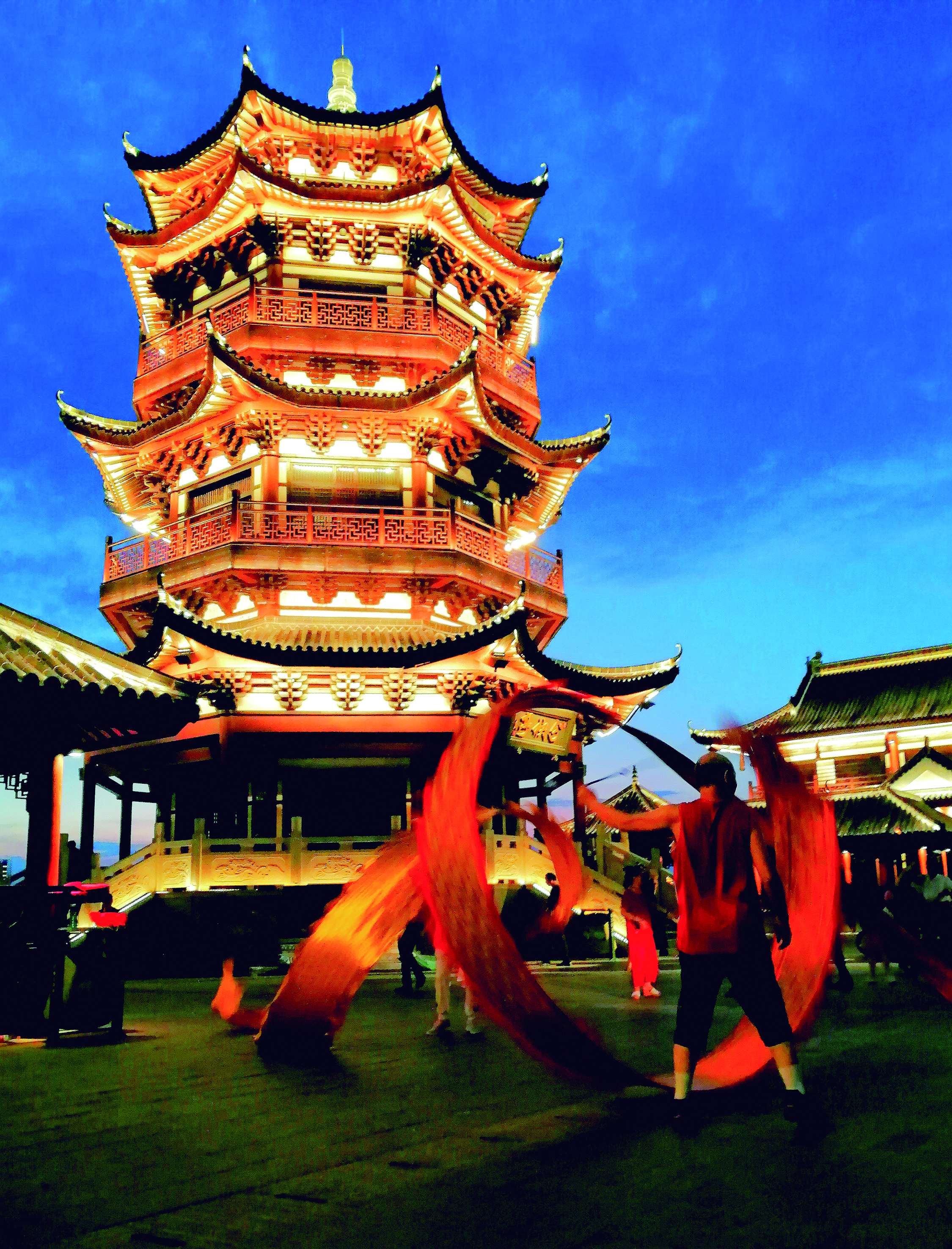 ▲近日,傍晚时分,市民在分决亭下舞小龙。网友/吴东沙 摄