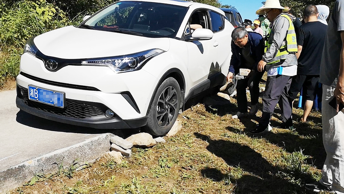 8月7日上午,炎陵县大院农场,在前往龟龙窝茶园的山路上,一名女士驾驶一辆汽车,因对路况不熟、操作失误,汽车不慎跌入路沟,造成拥堵。烈日下,游客们纷纷下车相助,有人指挥,有人出力气。大家先是抬车、拖车,均不奏效。最后,大家找来石块,垫在路沿下方,一位游客帮忙驾驶,终于把汽车成功开上来,现场欢呼声一片。