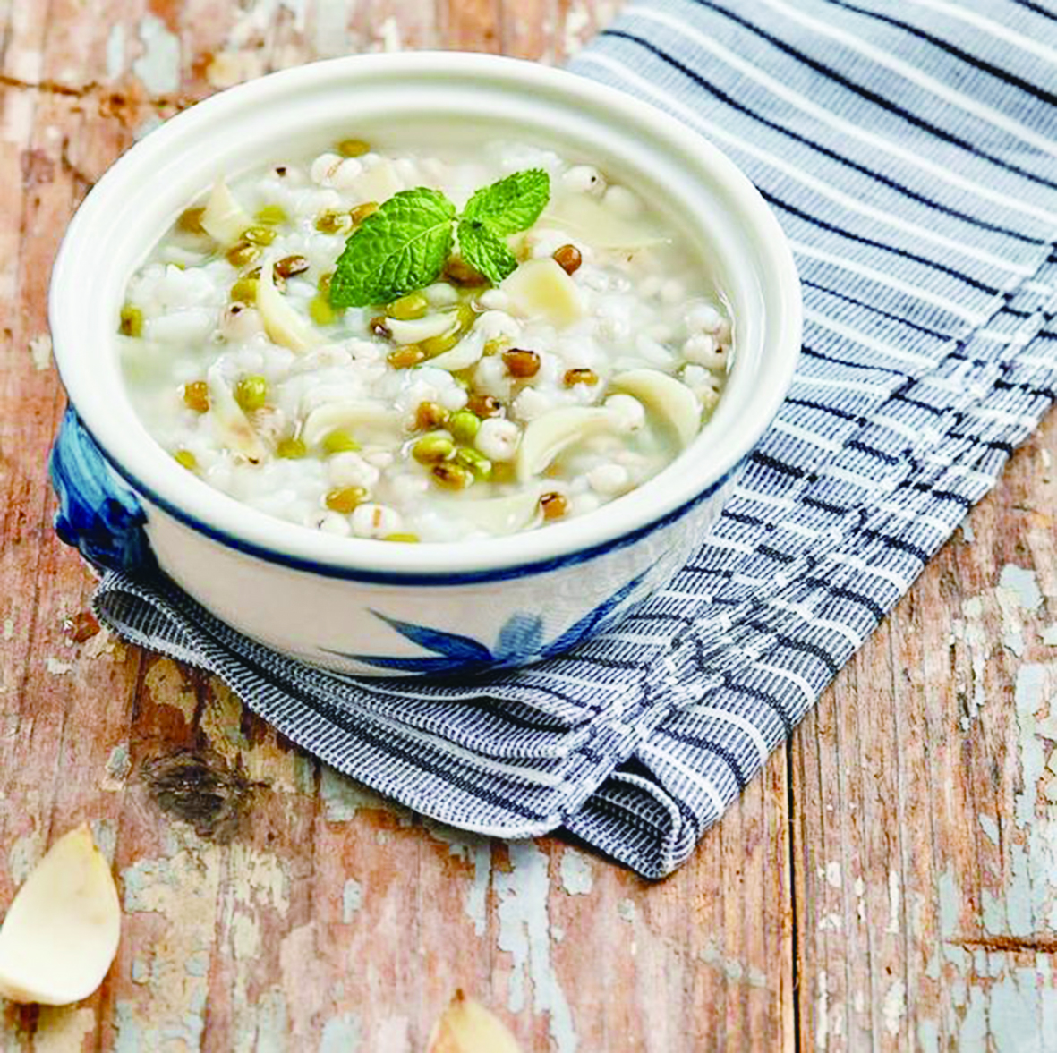 做法:取薏米、绿豆、大米各100克。将薏米、绿豆洗净分别浸泡1小时,大米淘洗干净。在锅中加适量清水,绿豆煮至裂开后加入薏米、白米,适时搅拌,煮至成粥,加糖调味即可食用。