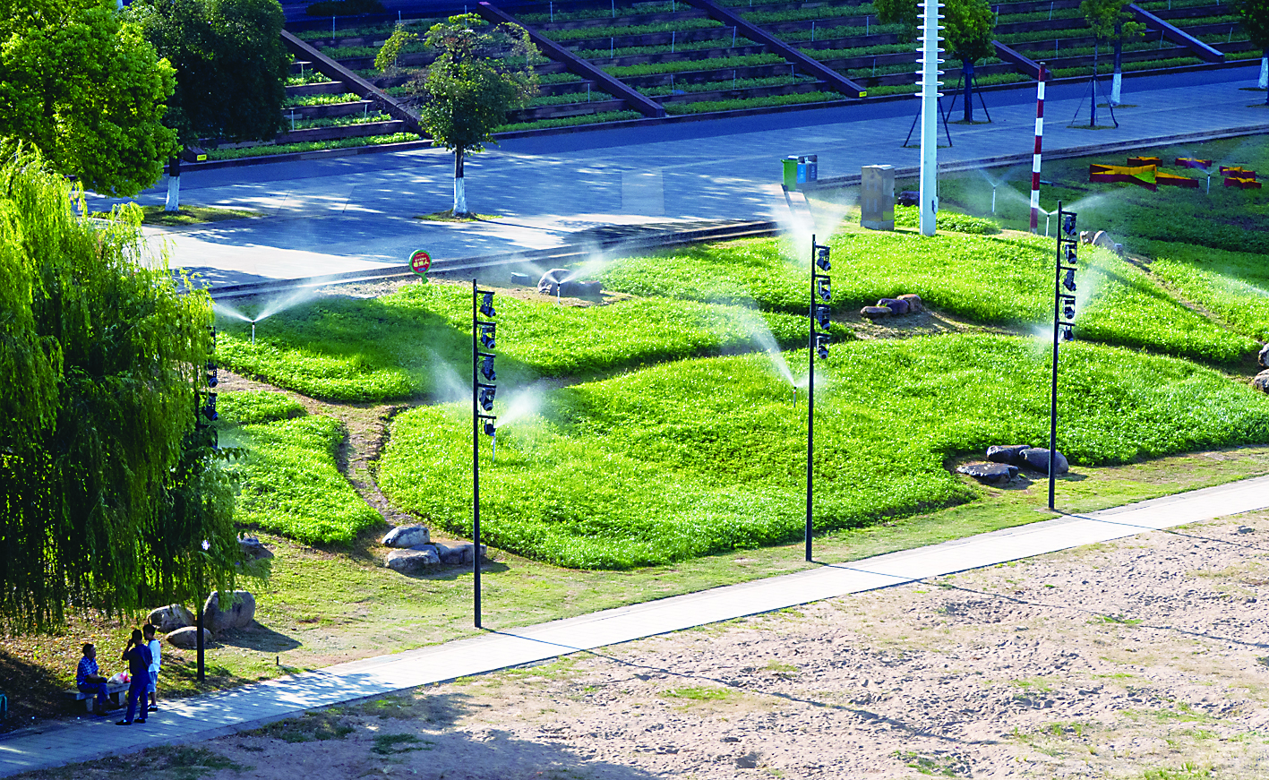 ◀高温天持续,植被也要及时补水。 株洲晚报融媒体记者/刘震 摄