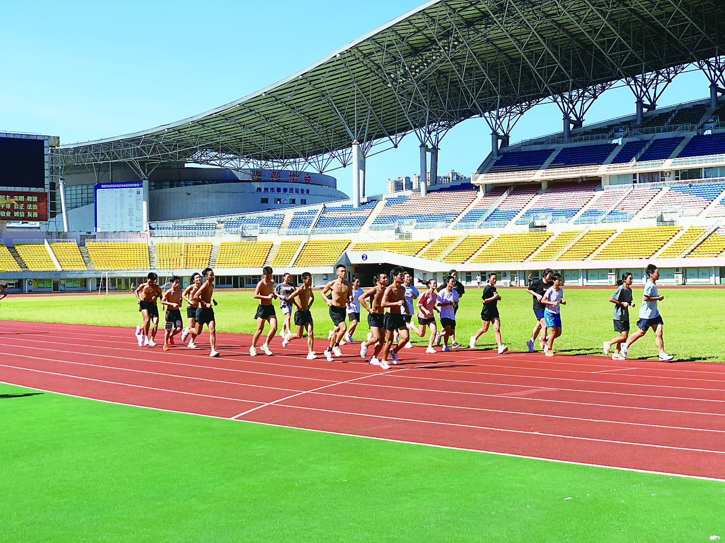 8月11日上午,记者在韵动体校看到,田径训练场已经有一群少年进行接力加速跑训练,他们的皮肤被阳光“烘焙”成油亮的古铜色,成为田径场上一道亮丽的风景线。