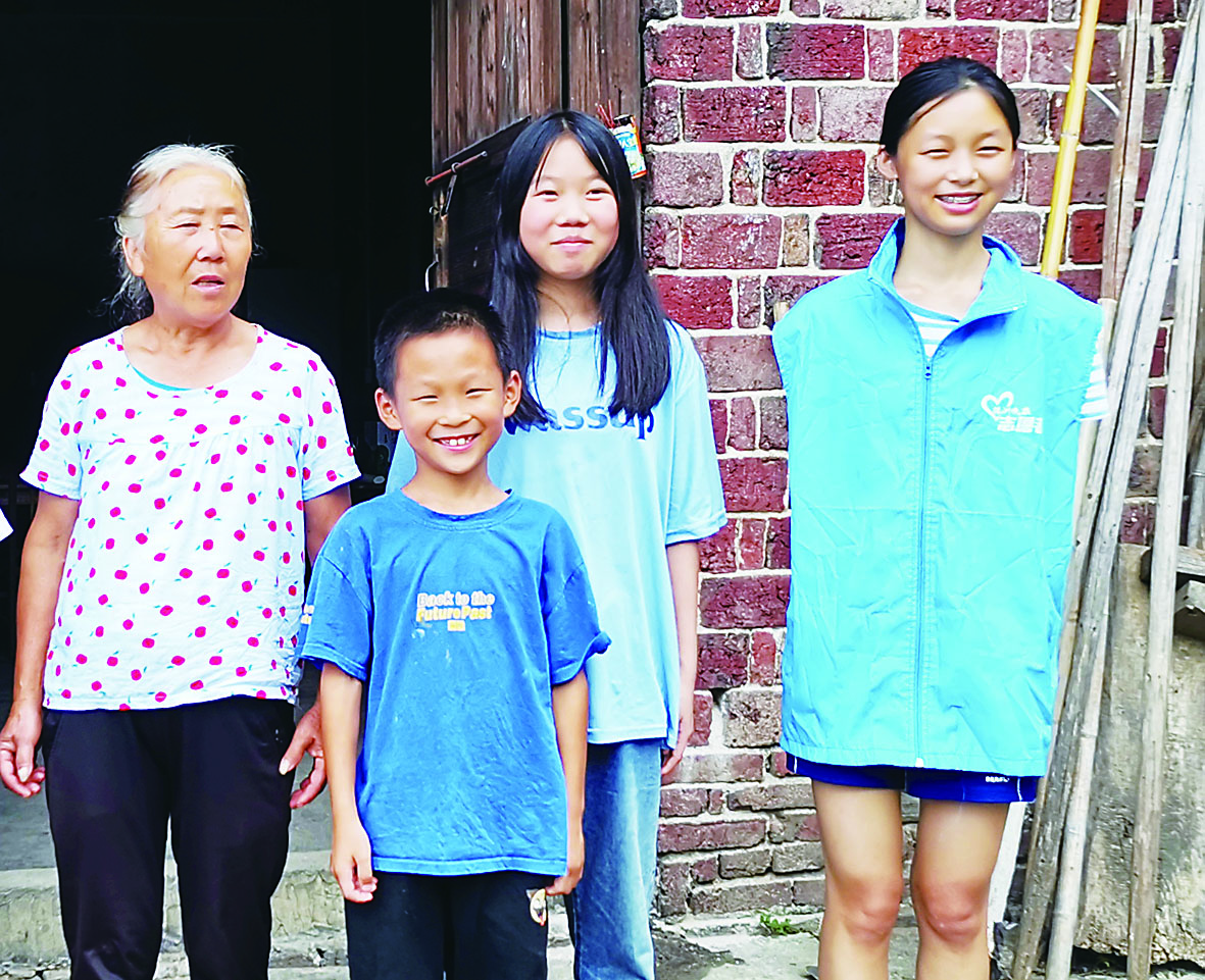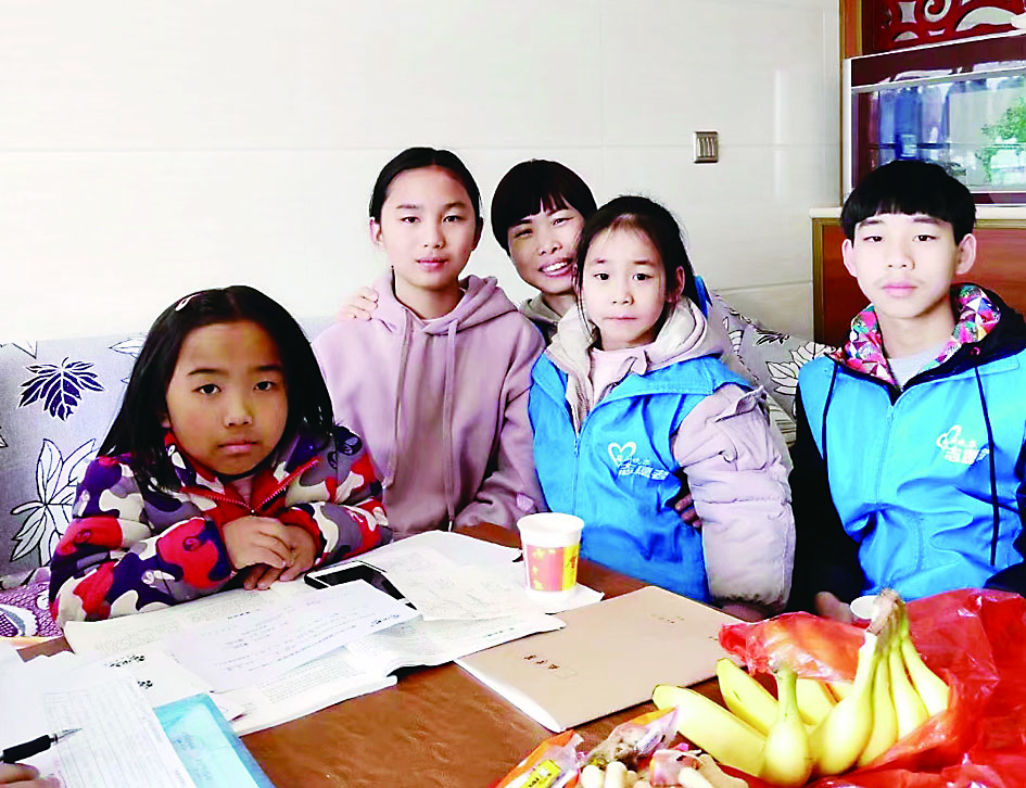 ▲宋楚皓(右一)和妹妹(右二)一起上门走访困难学生家庭。受访者供图