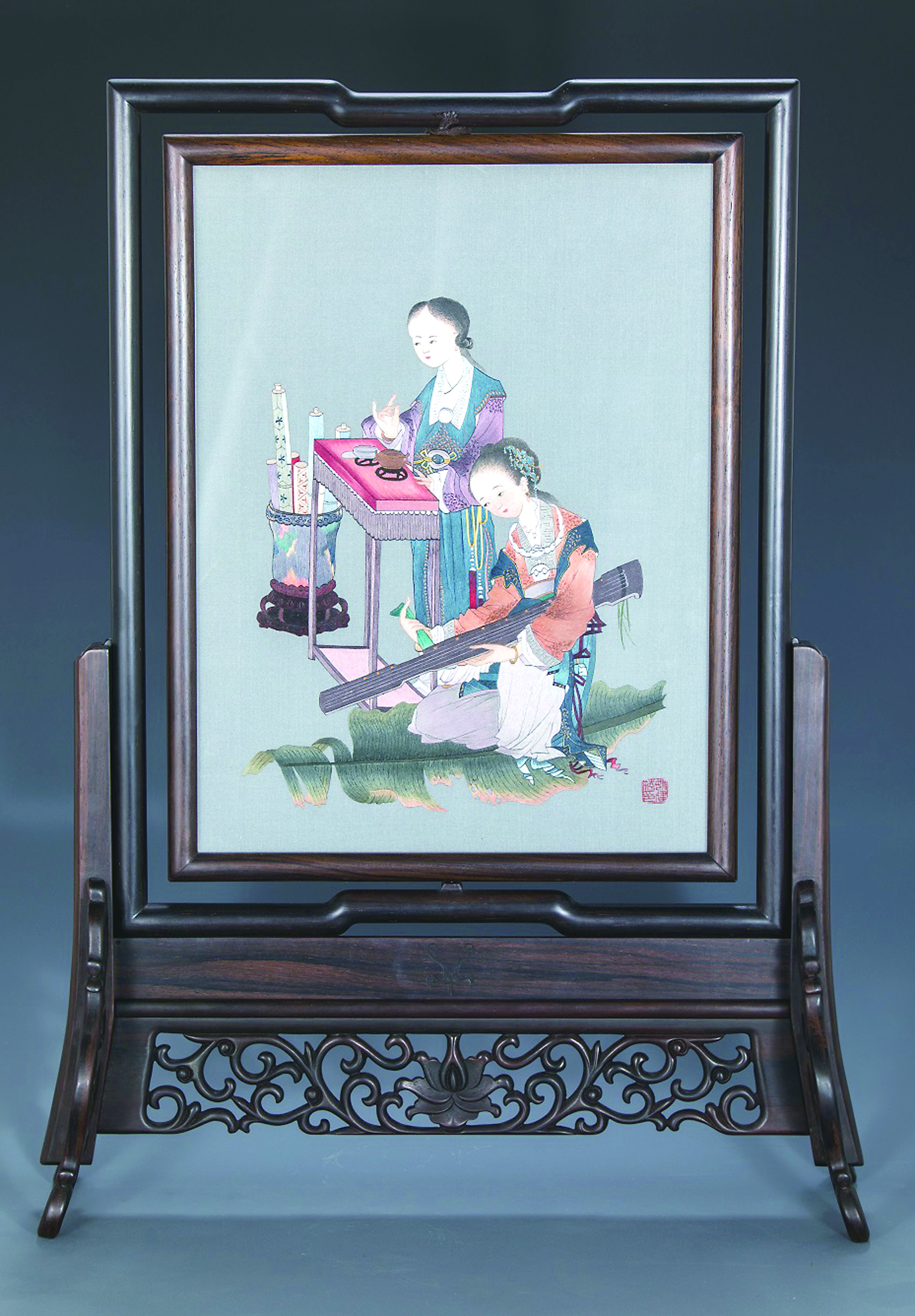 姚建萍从事苏绣事业30余年,在传承前辈技艺的基础上,开创了独具特色的“融针绣”风格。她将油画、摄影、雕塑、国画、书法的线条、结构、色彩、光影变化融为一体,与传统刺绣针法有机结合,注重作品的唯美主义倾向,强调光影色彩的自然过渡,大胆追求色彩的斑斓丰富,充分运用平针绣和乱针绣的各自特点,中西融合,古今融合,巧妙变化中灵活运用平乱转换,以及吸收各大绣种流派的特点,集大成于一体。作品《抚琴闺秀》为双面绣,两名女子一人立于案前焚香吟诗,一人跪坐拭琴,很好的表现出了人物与背景的空间感、色彩的光影感,以及服饰面料和桌案卷轴的对比质感。作品质感细腻、配色协调、自然的明暗表现与传神的人物刻画,融入了吴地文化的丰厚底蕴,体现出“精、细、雅、洁”的独特艺术风格。