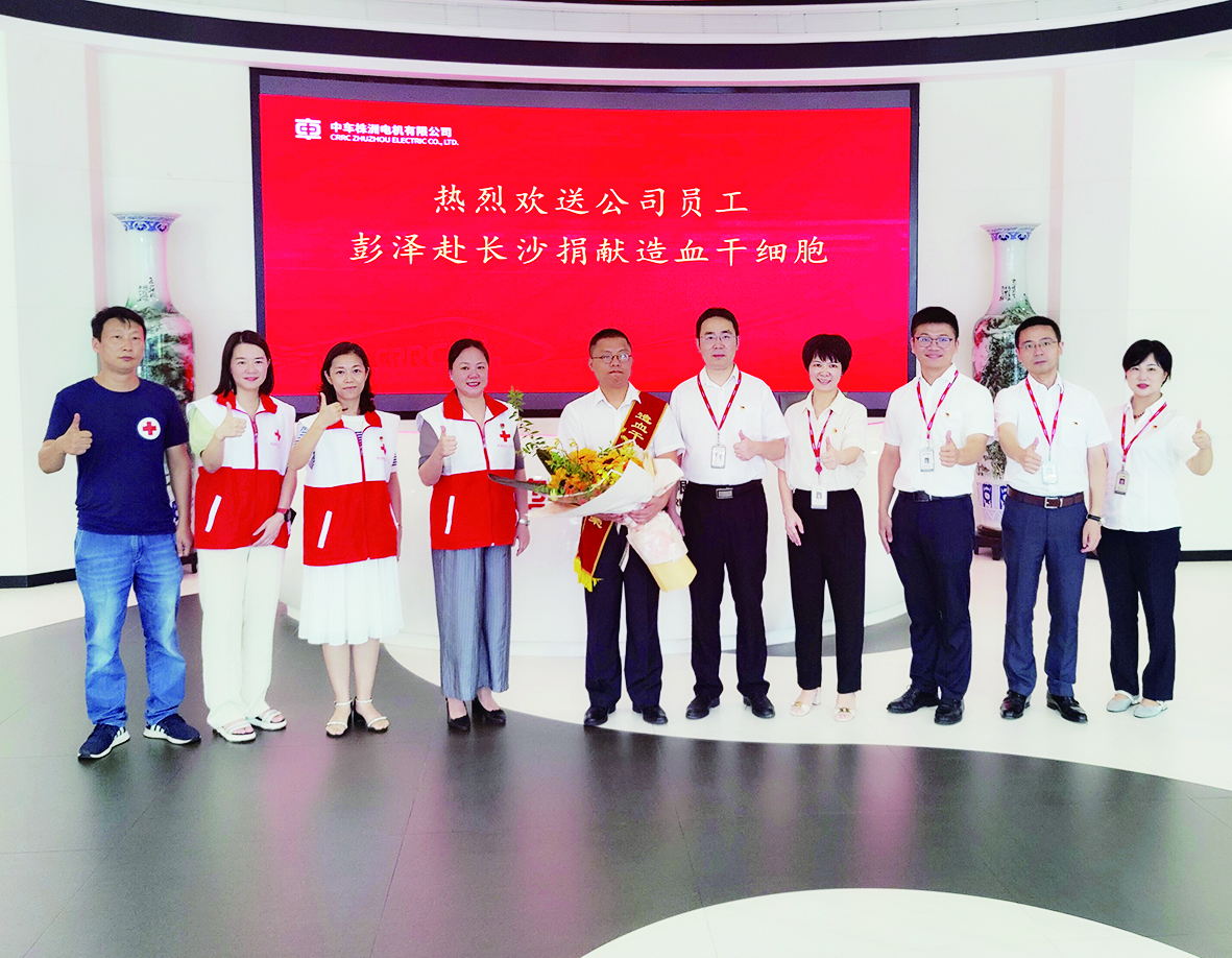 ▲中车株洲电机有限公司与市红十字会为彭泽(左五)举行欢送仪式。 记者/易楚曈 摄
