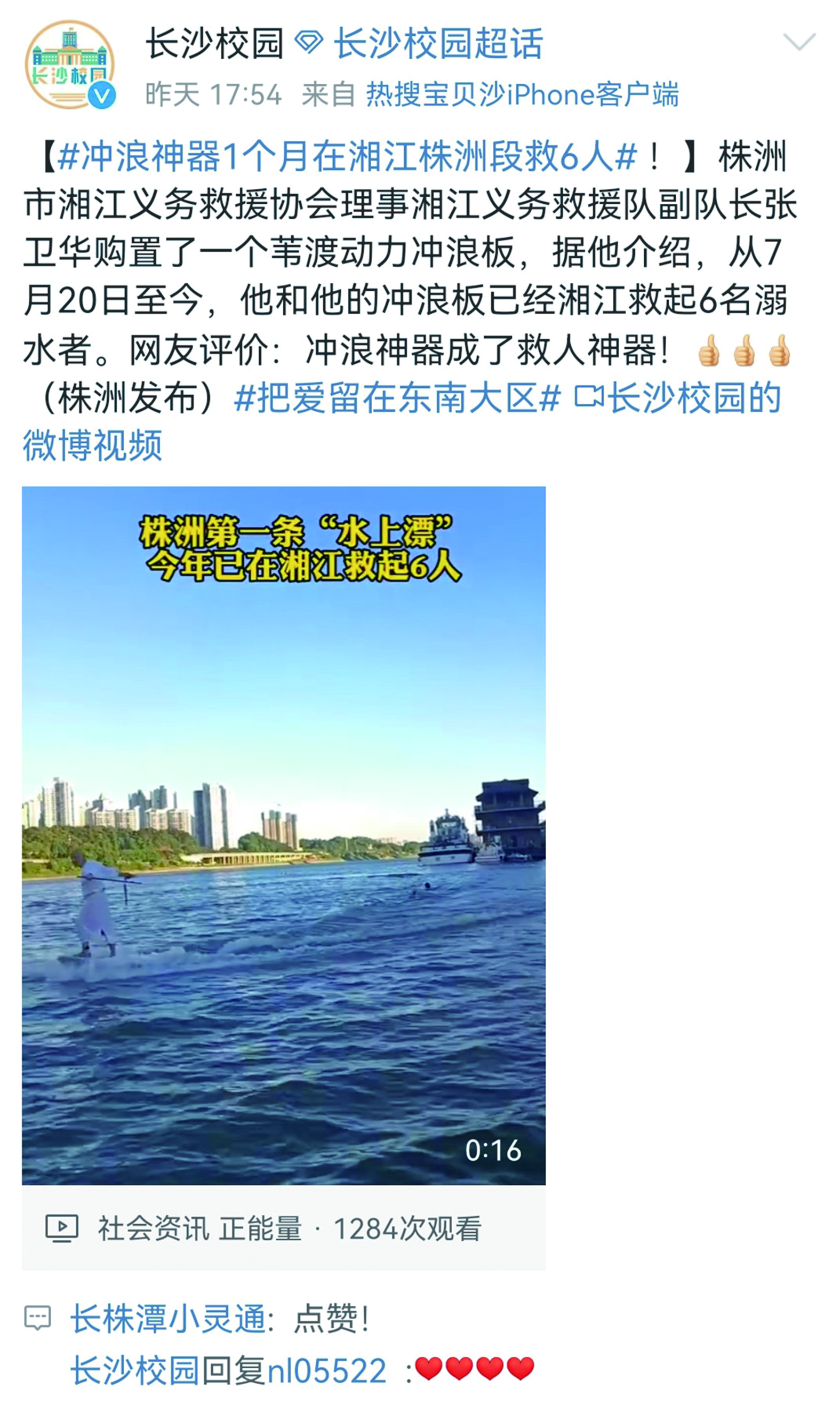 今年夏天,株洲市湘江义务救援协会理事、湘江义务救援队副队长张卫华购置了一个苇渡动力冲浪板。据介绍,从7月20日至今,张卫华和他的冲浪板已经在湘江救起6名溺水者。网友点赞:冲浪神器成了救人神器!