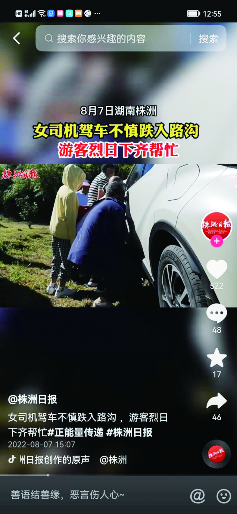 近日,炎陵县大院农场的山路上,一名驾驶人员因对路况不熟导致操作失误,使汽车跌入路沟。烈日下,游客们纷纷下车施以援手,帮助车辆脱困,山路也恢复了正常通行。