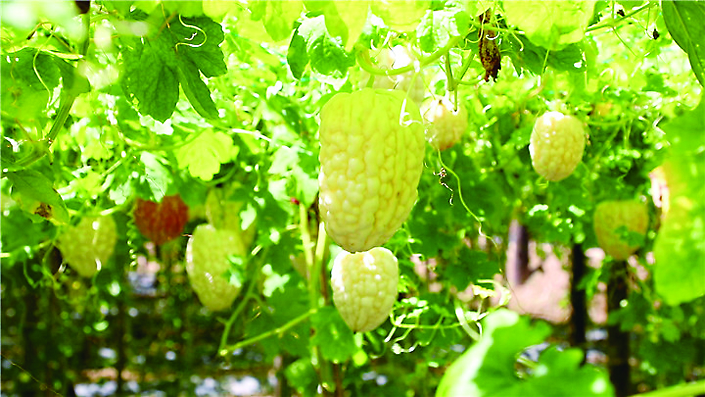 8月14日,沿着蜿蜒的山路行驶,穿过苍翠竹林,记者来到新华村的种植基地,只见一个个白嫩嫩、圆乎乎的苦瓜挂满枝头,泛着亮眼的光泽,突起的表皮宛如一颗颗白玉,晶莹剔透。